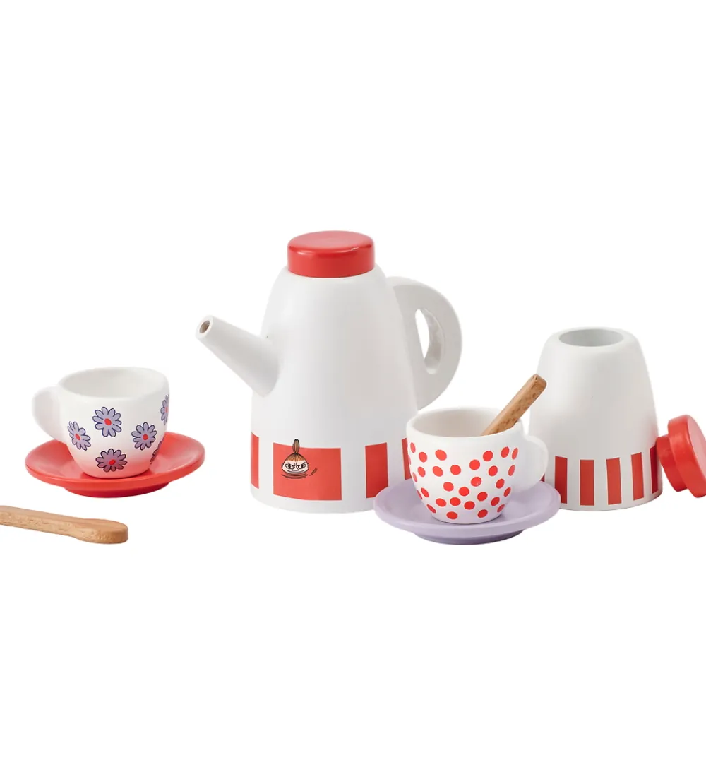 Flot Kids Concept kaffestel af hvidlakeret træ med røde og lilla detaljer og med et fint print med figurer fra Mumitroldene.