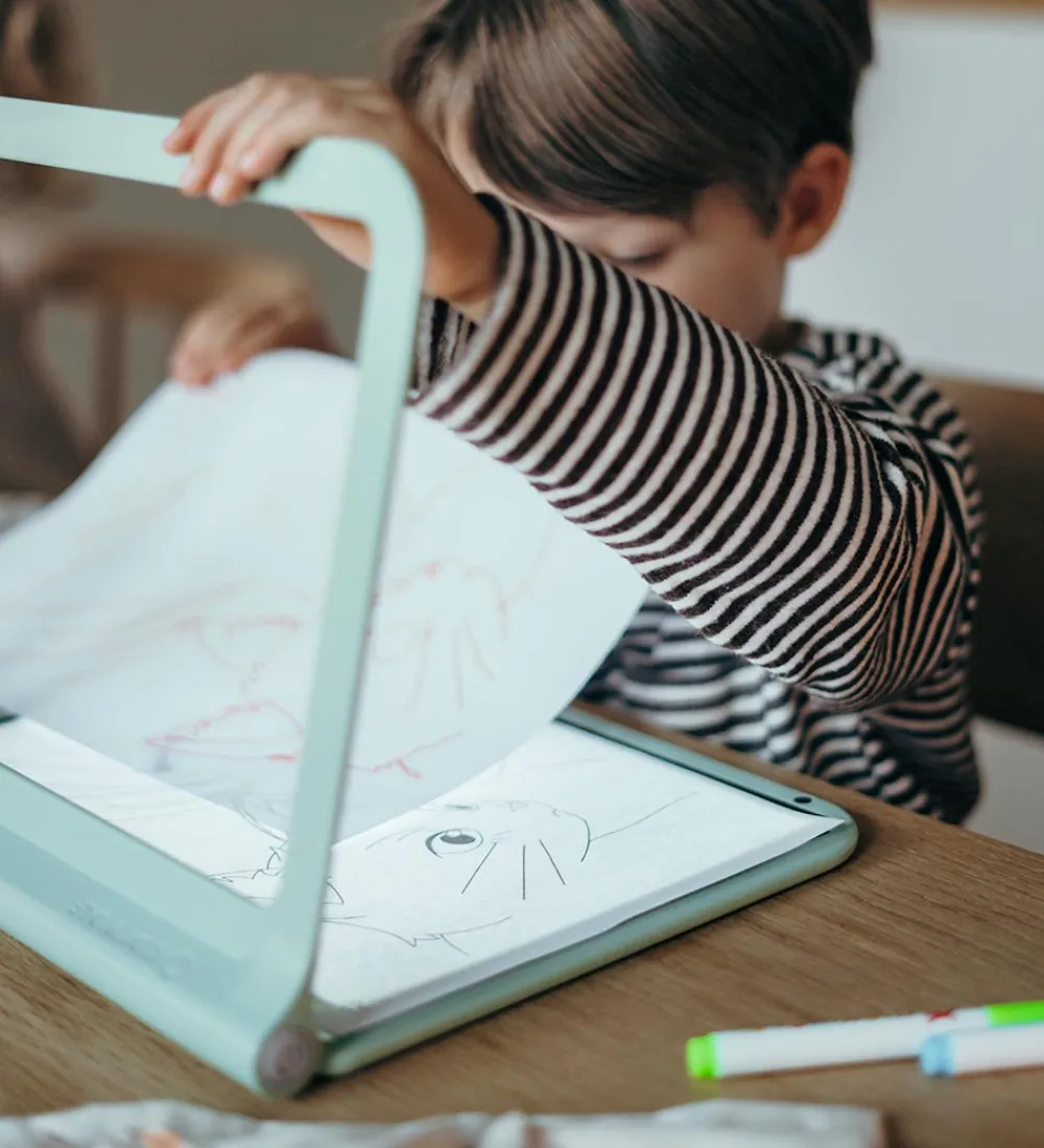 Tegnetavlens ramme kan åbnes og lukkes, så papiret kan placeres nemt og holdes fast, men designet betyder også, at tegnetavle kan stå selv og viser, når der er blevet lavet en flot glow in the dark-tegning.