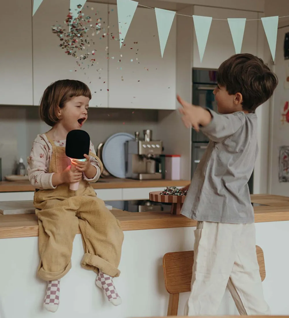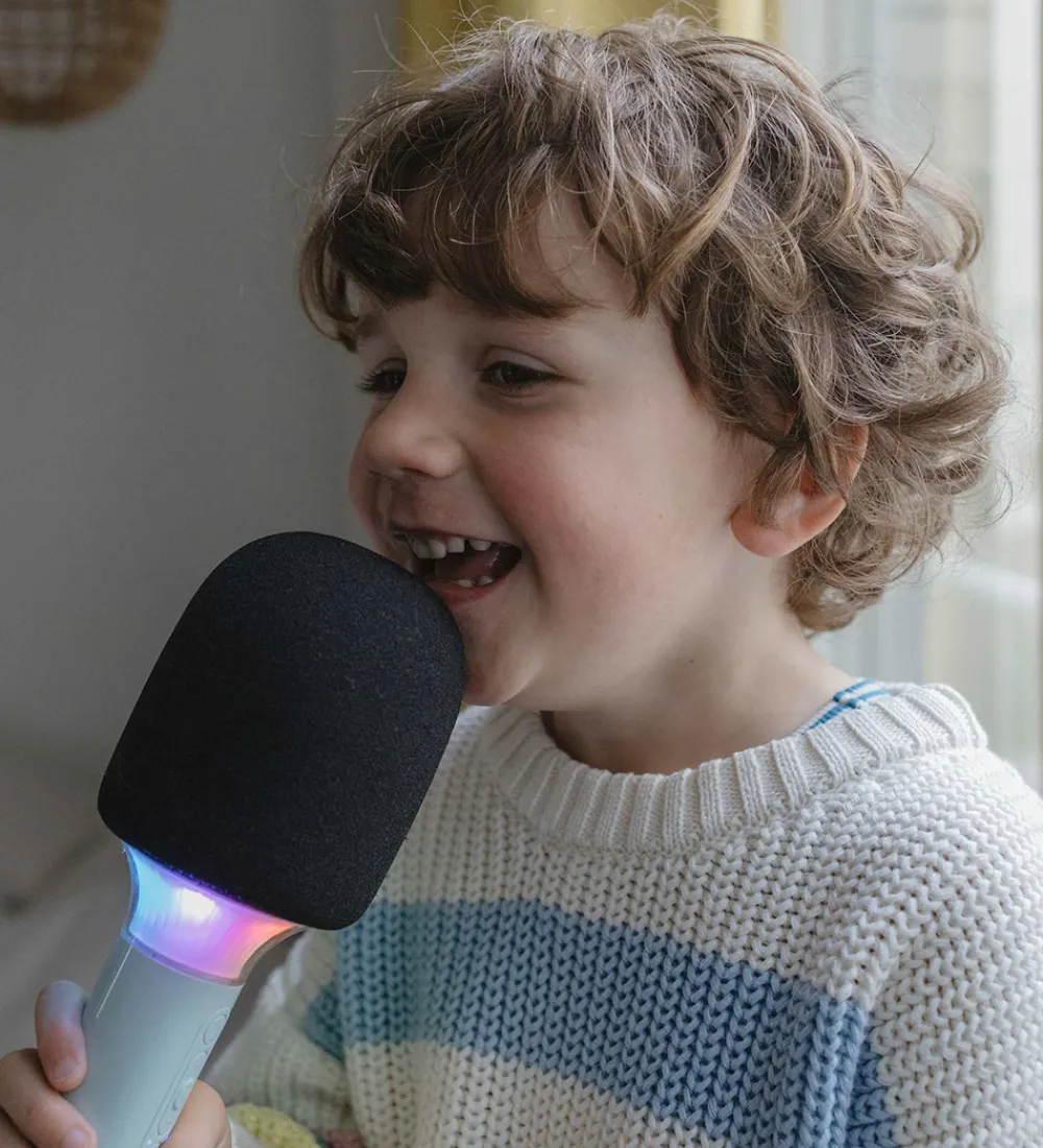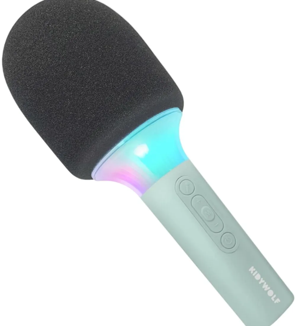Sjov Kidywolf mikrofon i lysegrå og sort. Mikrofonen har indbygget LED-lys, som kan lyse op i forskellige farver. Mikrofonen kan fungere som almindelig mikrofon, men kan også indstilles så den ændrer stemmen. Den kan kobles til andre devices via bluetooth. Der medfølger et USB-C kabel, som kan oplade mikrofonen. Mikronen kan tændes, slukkes og indstilles på håndtaget.