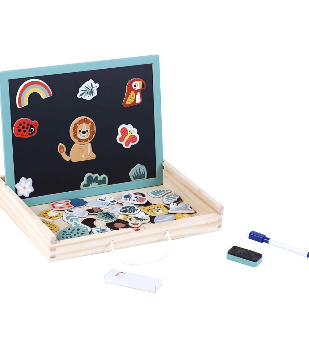 Kinder and Kids aktivitetslegetøjet består af en kasse med et magnetisk, tosidet låg, hvor den ene er en kridttavle og den anden er et whiteboard, hvor der kan sættes de mangle medfølgende magnetbrikker, som danner dyr og natur. Der medfølger også tavlekridt, en whiteboard pen og en tavlesvamp.