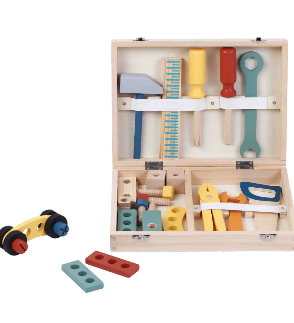 Fascinerende trælegetøj fra Kinder and Kids i en farverig værktøjskasse, der indeholder forskellige værktøjer og byggeklodser. Dette sæt stimulerer kreativiteten og leg med spændende elementer i form af 8 forskellige stykker værktøj, flere skruer og møtrikker og konstruktionstræ med hul i til at skrue sammen.