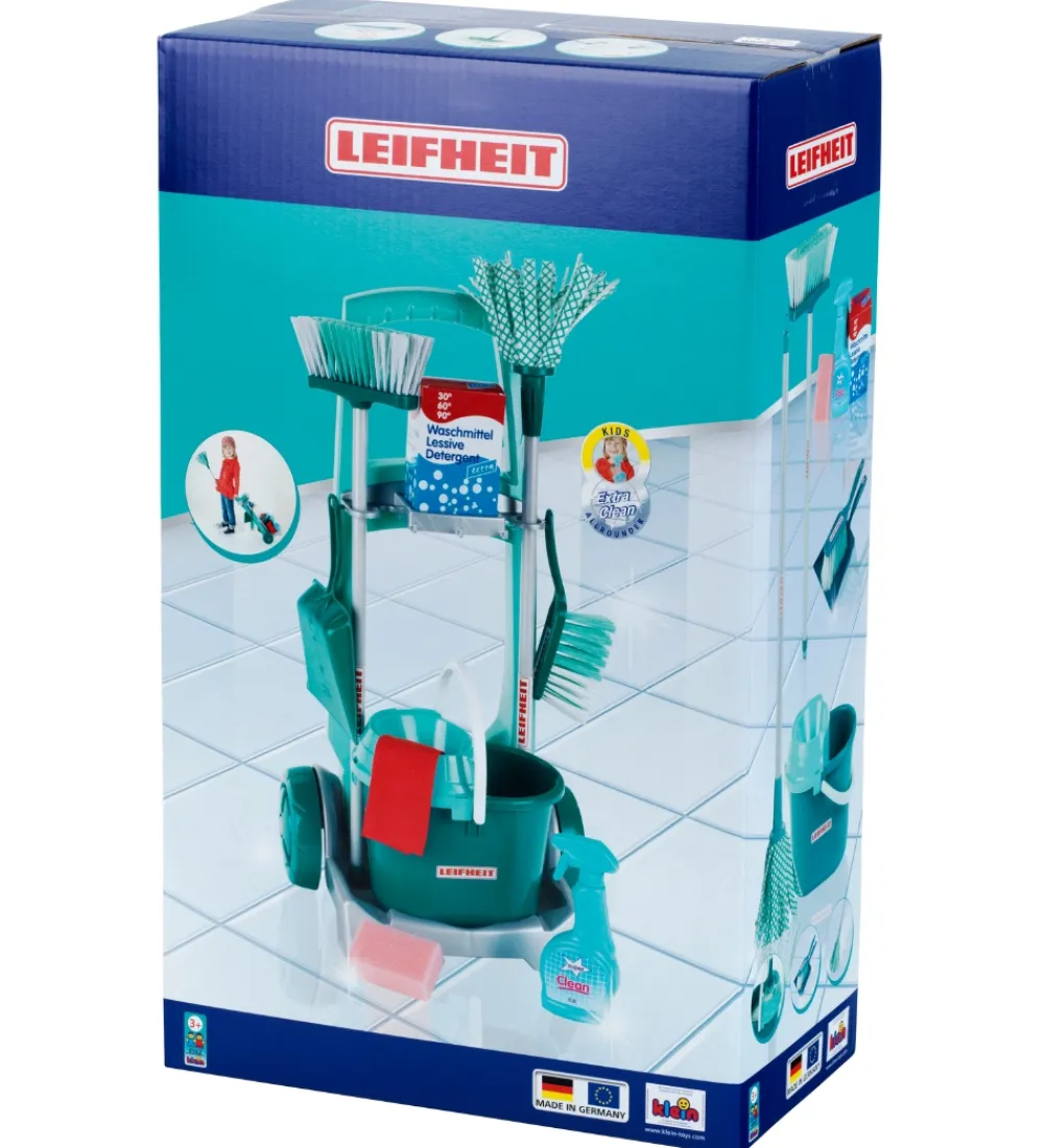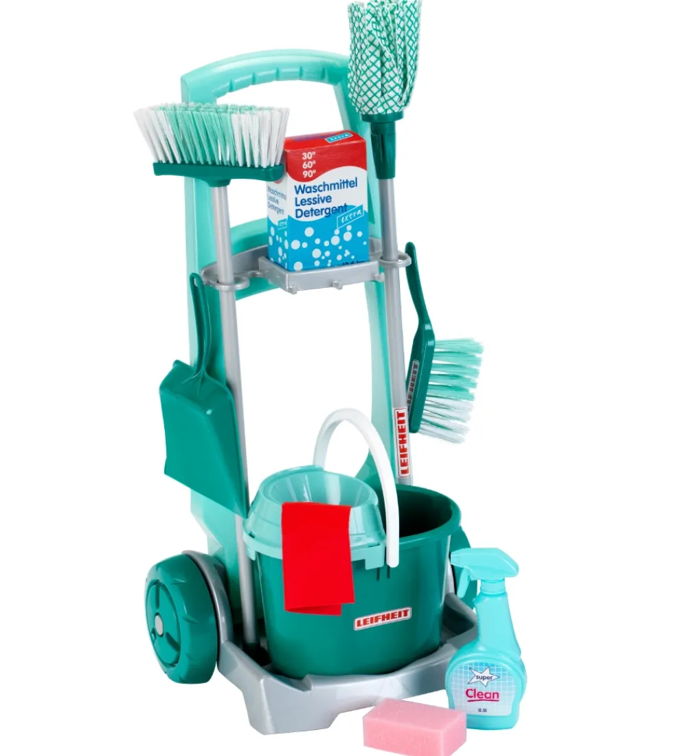 Sjov Klein rengøringsvogn med alt det nødvendige udstyr til at gøre rent.