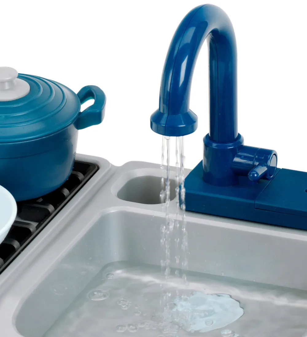 Klein minikøkkenets vandhane kan fyldes med vand, så der kan løbe ud af vandhanen.