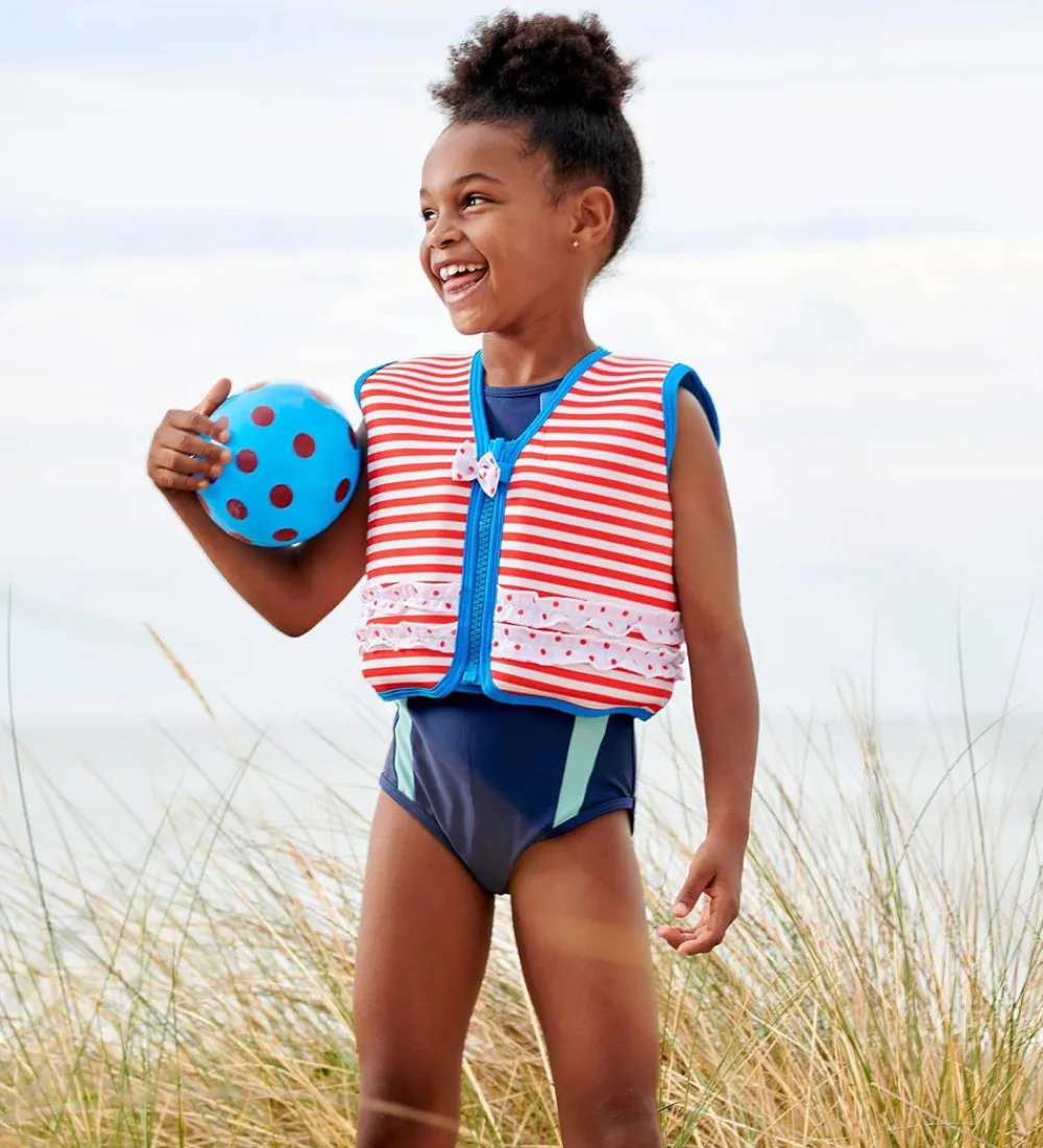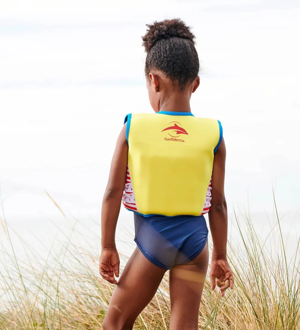Lækker Konfidence svømmevest med røde og hvide striber samt blå kanter. Bagtil er Konfidences velkendte delfinlogo øverst på ryggen, som er gul for at gøre svømmevesten synlig i vandet. Svømmevesten er fremstillet i blød og behagelig neopren, som er et fleksibelt materiale, der også er i våddragter. Neopren beskytter ligeledes mod solens UV-stråling, samtidig med den holder på barnets kropsvarme både i og ude af vandet.