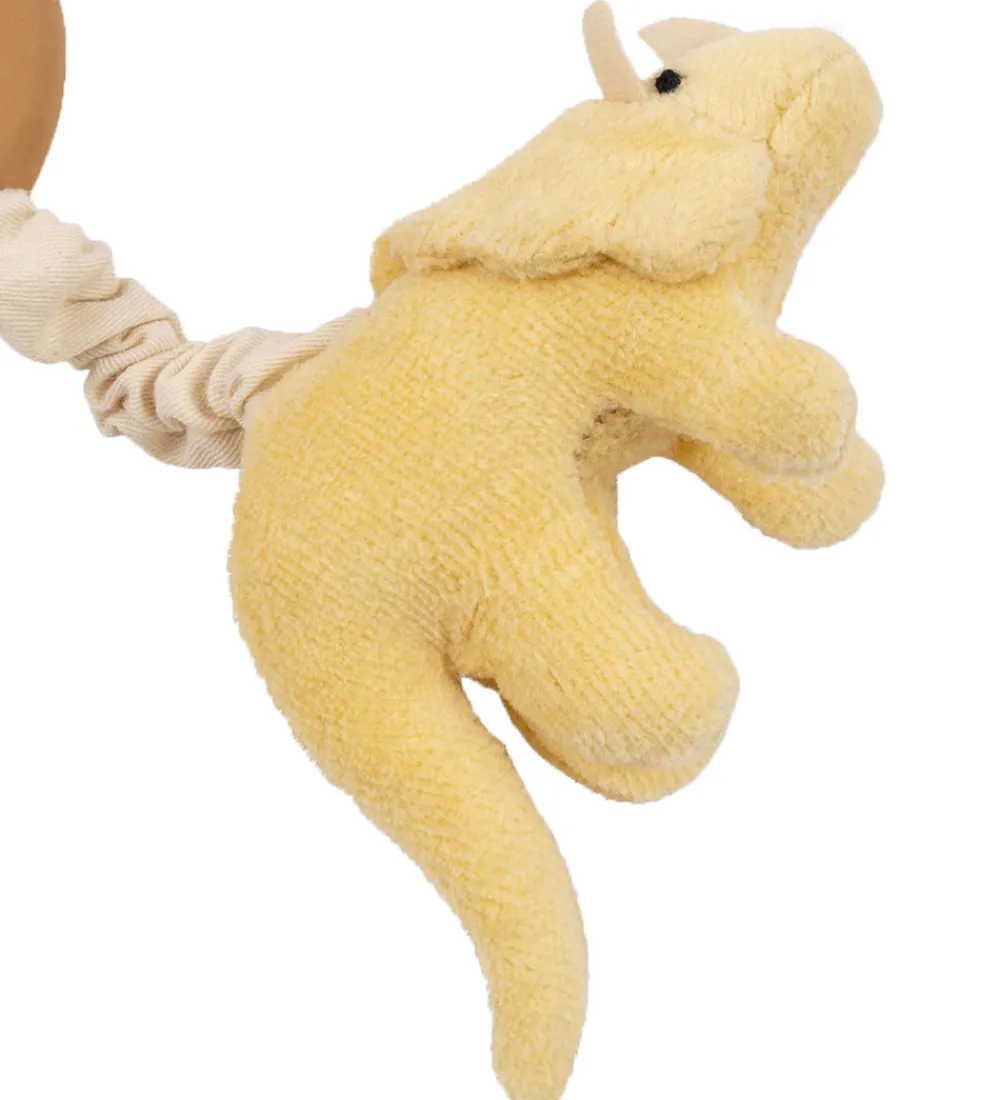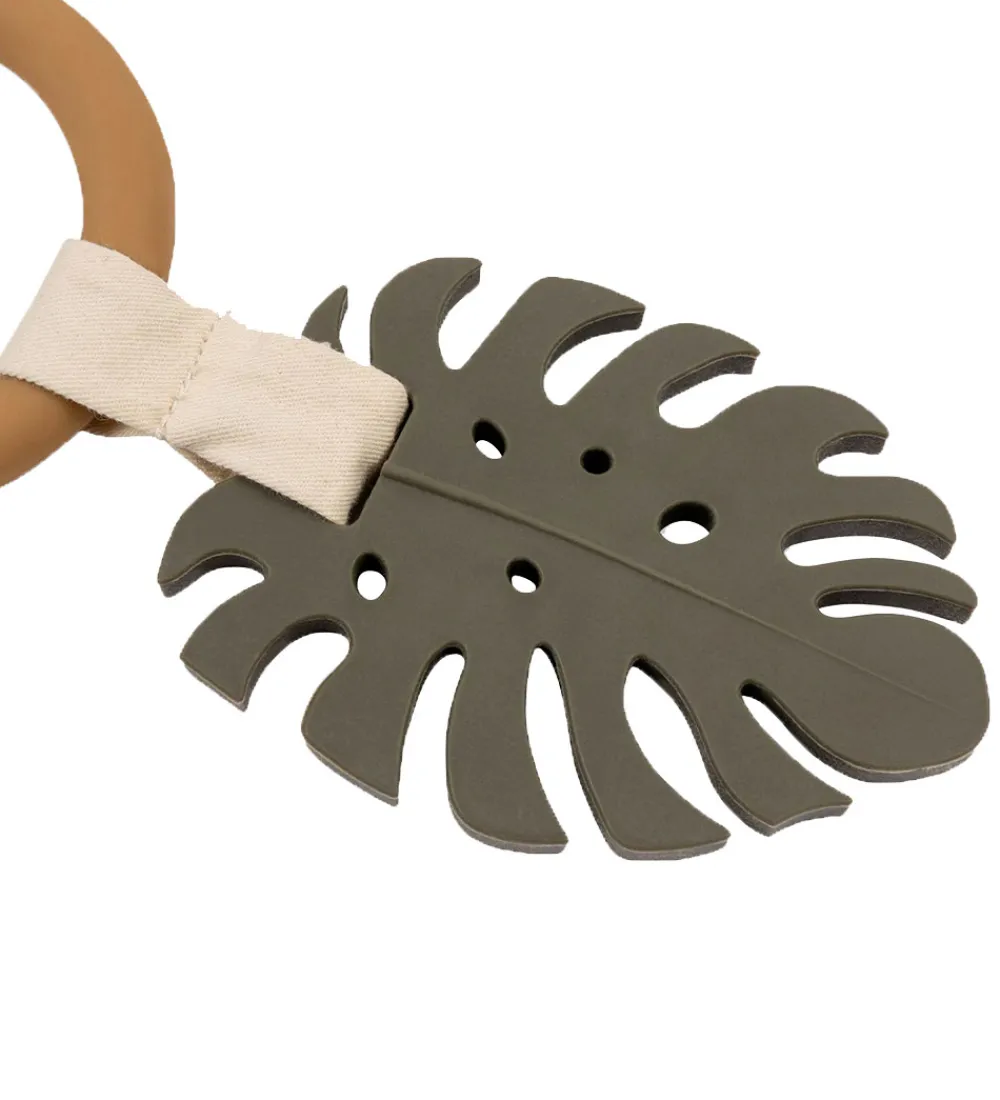Sjov Konges Sløjd aktivitetsring med vedhæng i et dino-tema med afdæmpede farver.