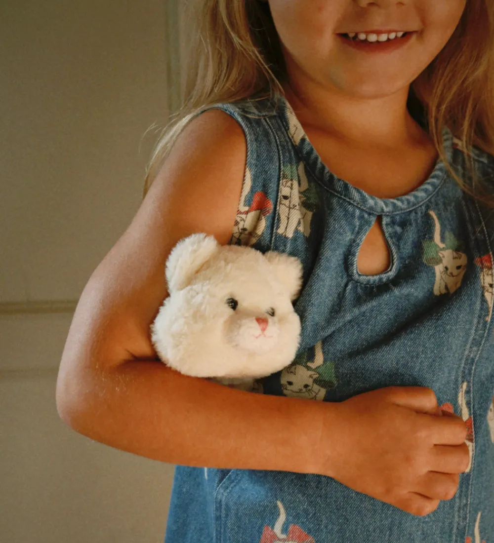 Charmerende Konges Sløjd bamse i lysebrunt og hvidt plys. Den bløde bamse er formet som en blød kat, men kan forvandles om til en fin hund, som giver et venligt udtryk. Perfekt som en kær følgesvend fra Konges Sløjd.