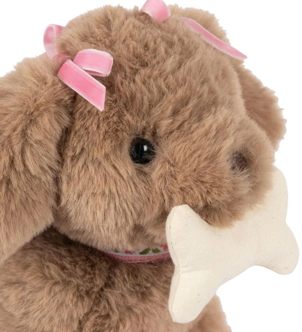 Charmerende Konges Sløjd bamse i lysebrunt plys, og den kommer i en lyserød taske. Bamsen har fine detaljer som en lyserød hundesnor og et hvidt kødben, som tilføjer et sødt touch. Perfekt til hyggelige stunder.