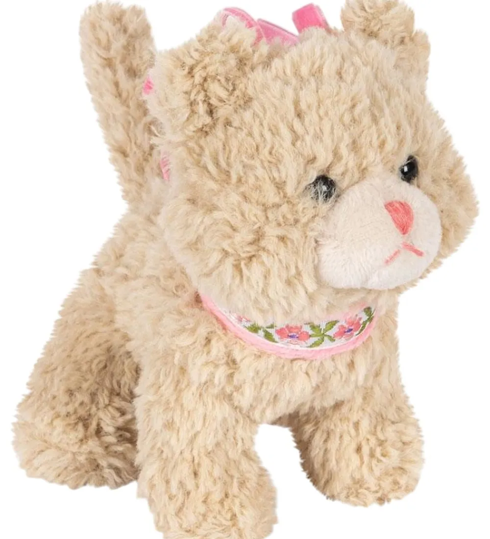 Charmerende rangle fra Konges Sløjd udformet som en blød kat i beige plys. Ranglen har detaljer som en lyserød snude og et blomstret bånd om halsen, hvilket giver et sødt udtryk.