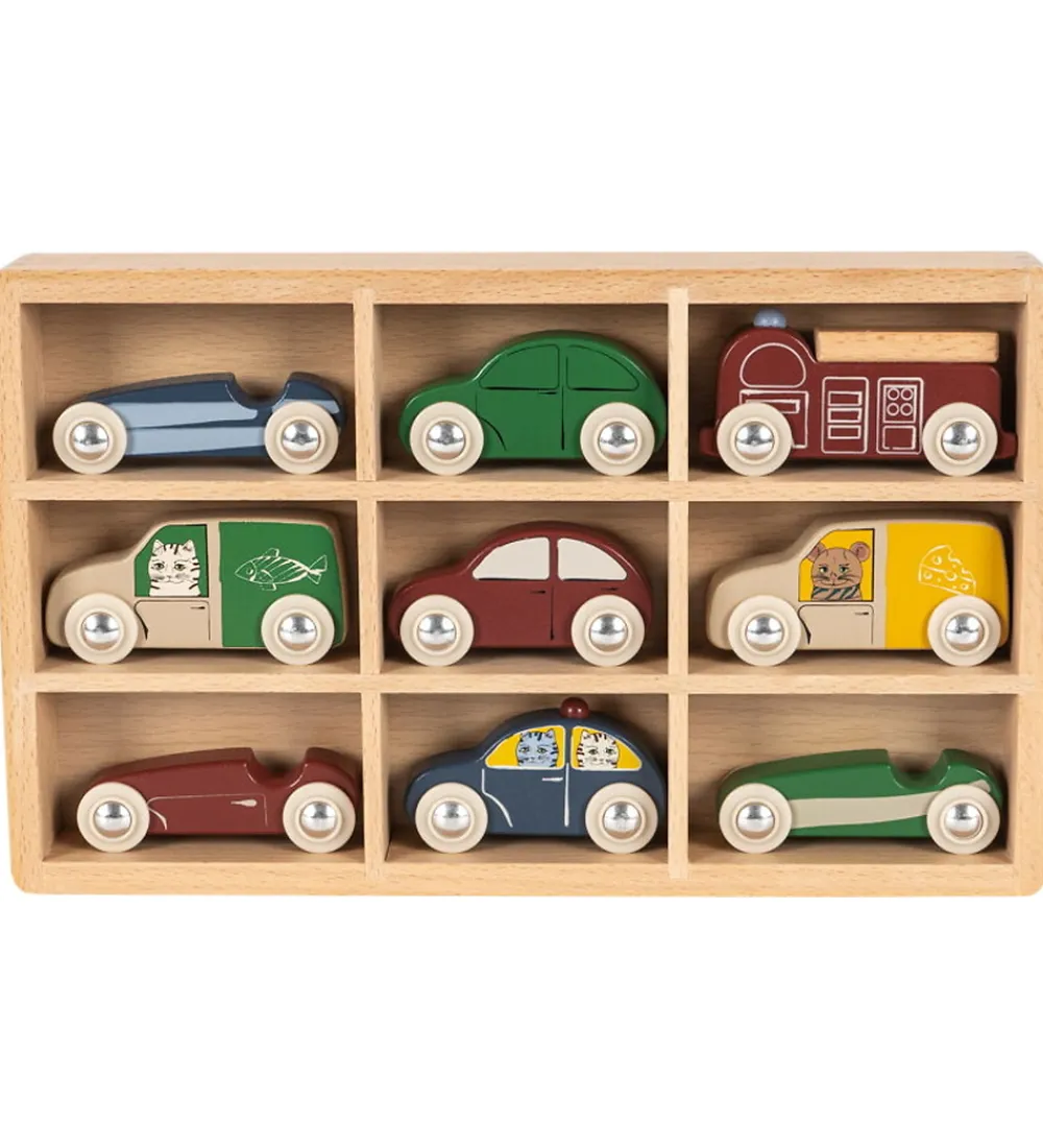 Hvert køretøj er dekoreret med unikke illustrationer, der tilføjer et sjovt og fantasifuldt element til legen. Perfekt til bilentusiaster. Bilsættet kommer med en træboks hvor bilerne kan opbevares.