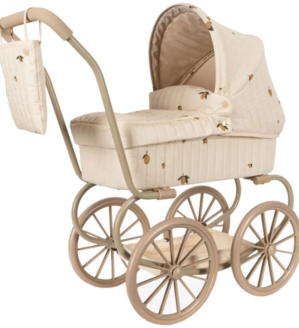 Pæn Konges Sløjd dukkebarnevogn i en flot vintage-stil. Stoffet er cremehvidt med print af små citroner over det hele og har en quiltet struktur og bølgede scallop-kanter.