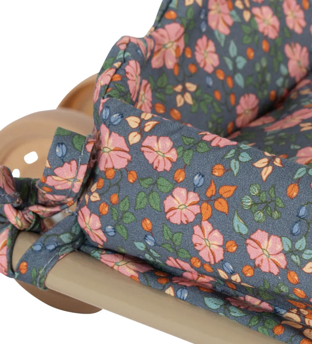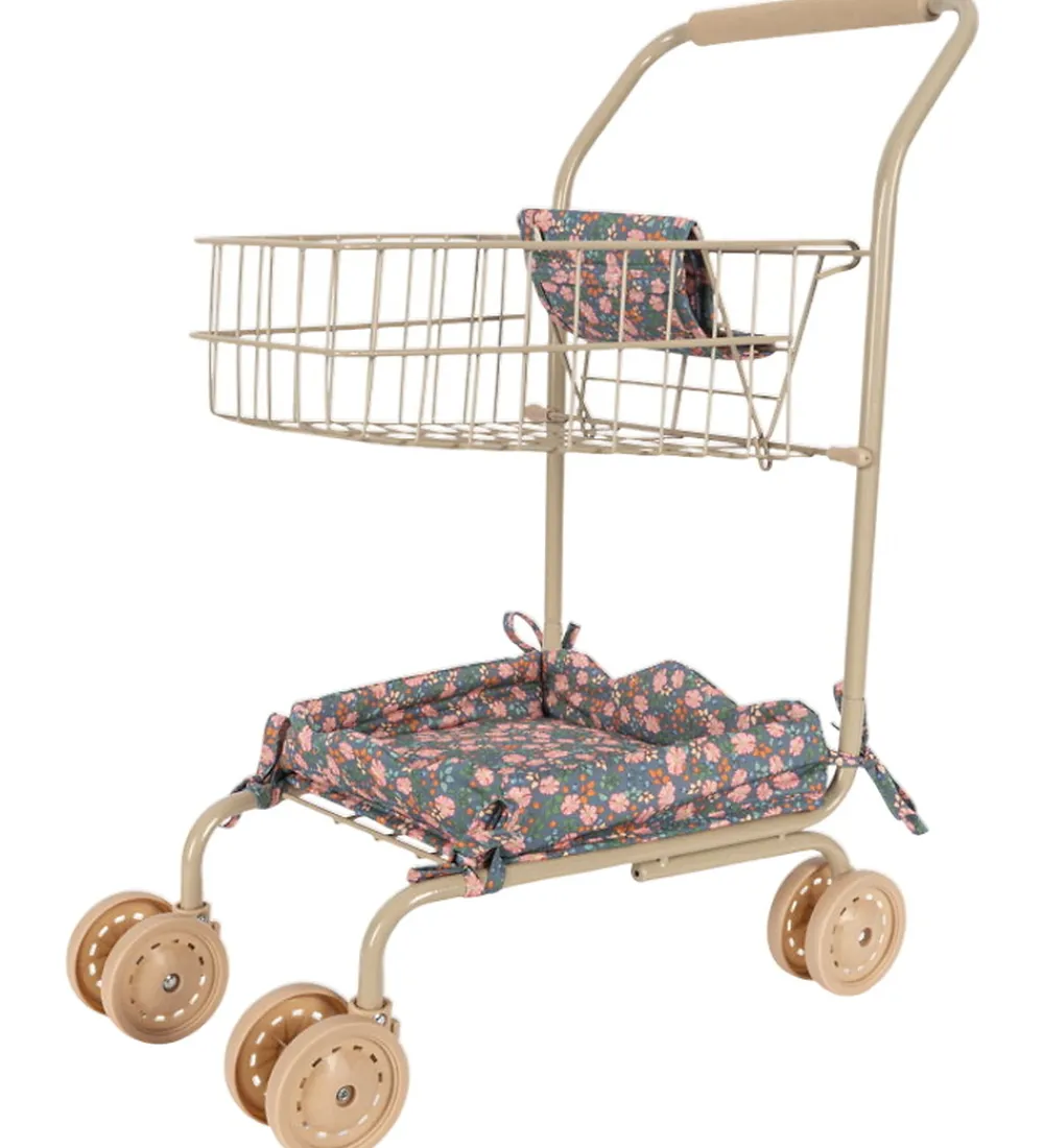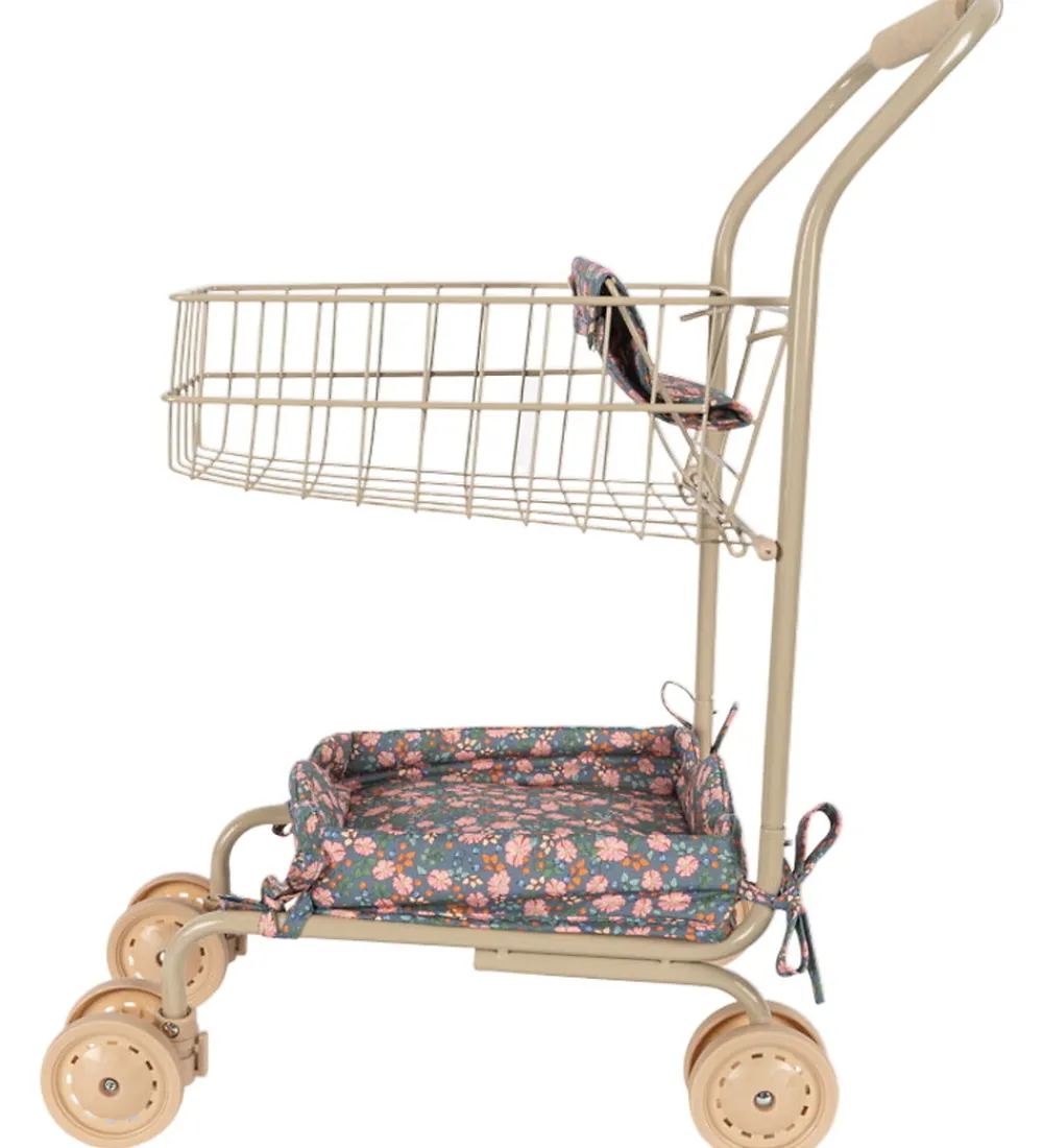 Flot Konges Sløjd indkøbsvogn i beigelakeret metal, og sædet og puden er grøn med pink blomster.