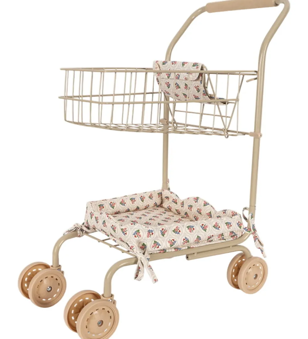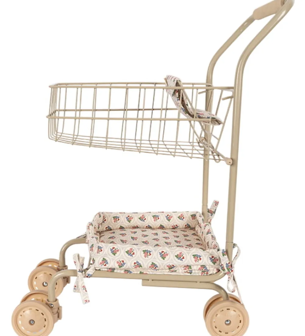 Flot Konges Sløjd indkøbsvogn i beigelakeret metal, og sædet og puden er beige med et print med røde og blå blomster.