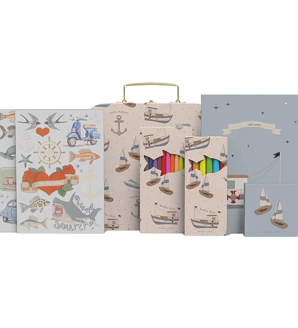 Smart Konges Sløjd kreasæt bestående af en lys, beigefarvet kuffert med 12 farveblyanter, 6 tusser, 6 oliefarver, 2 ark med klistermærker og en notesblok. En fornøjelse for enhver lille kunstner at udforske og skabe med.