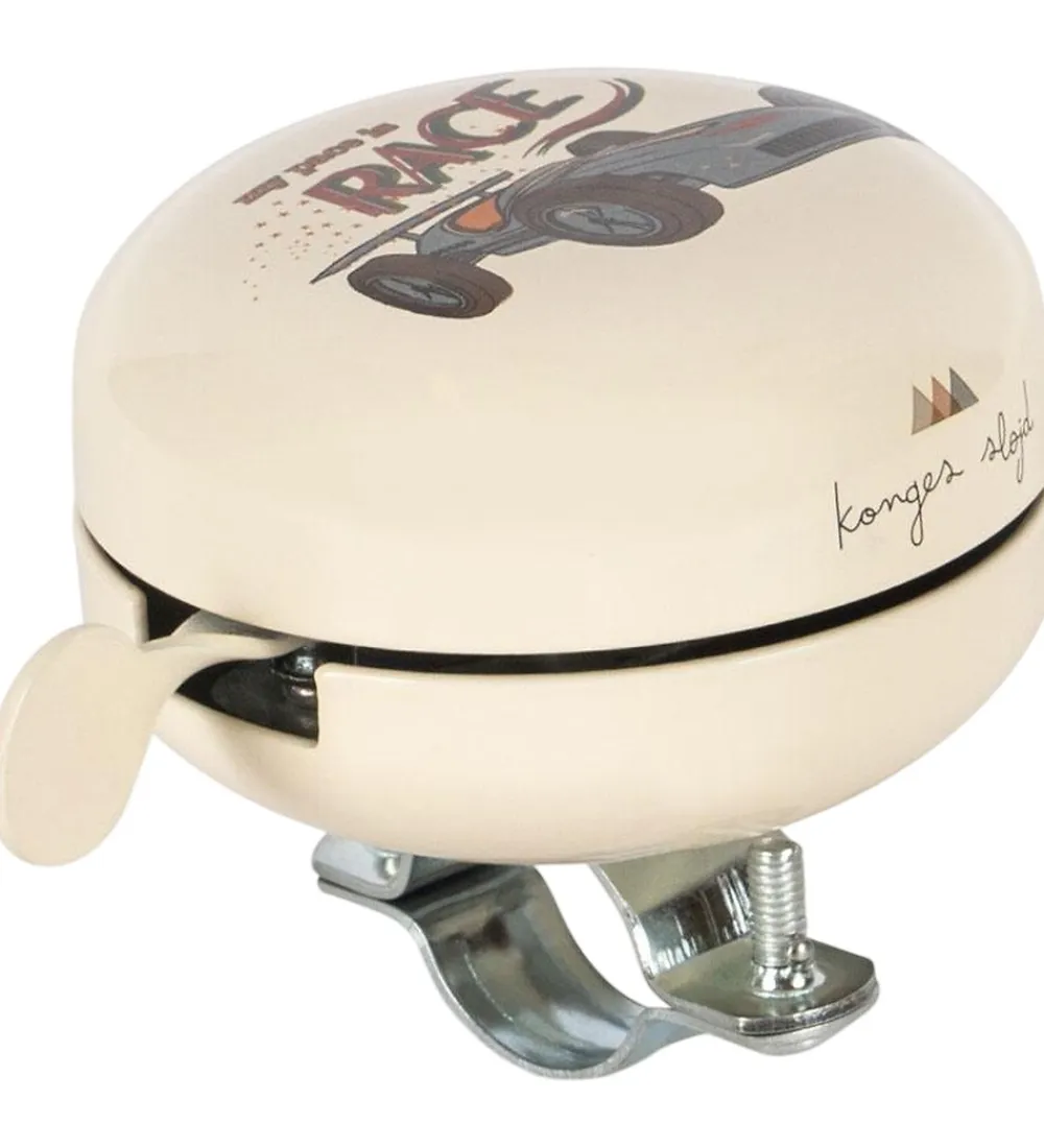 Sej Konges Sløjd ringeklokke i cremehvid med et flot print af en racerbil. Konges Sløjd ringeklokken er lavet i stål og kan sættes på cykler og balancecykler.