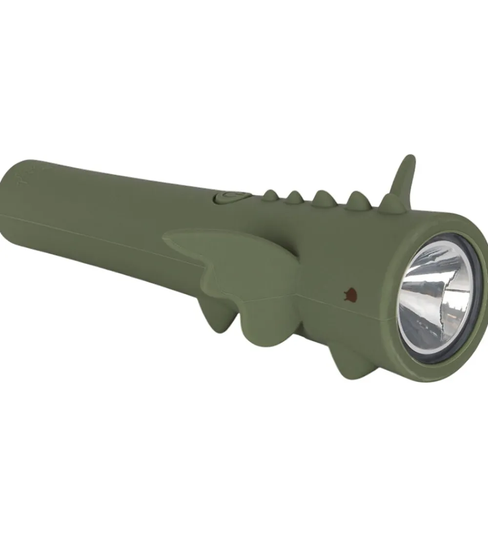 Fin Konges Sløjd lommelygte i et sødt, olivengrønt dragedesign.