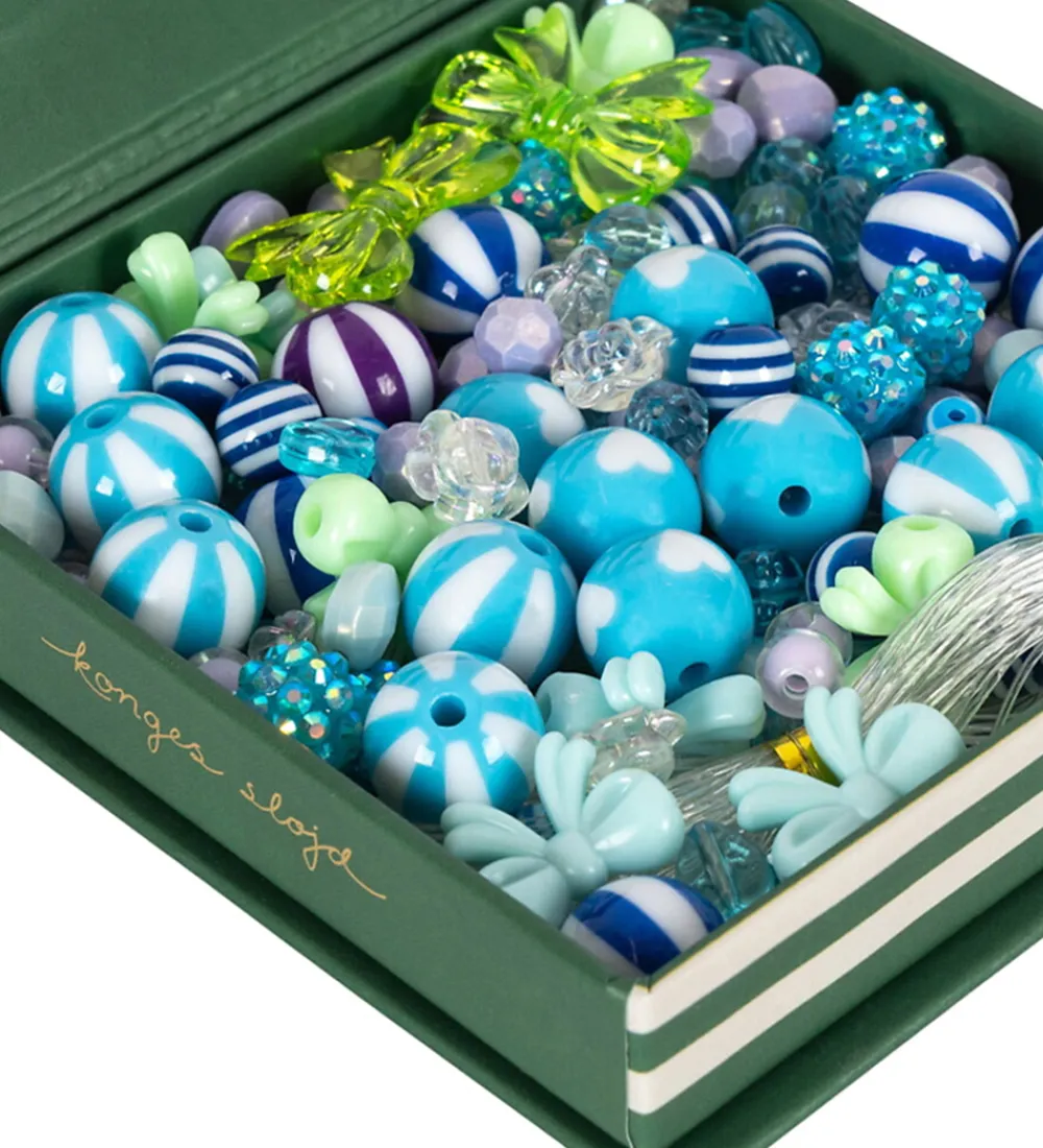Farverige perler fra Konges Sløjd i blå nuancer, og som kommer i en grønstribet æske med hjerterude. Pakken indeholder 200 perler i forskellige former og størrelser, der indbyder til kreativ leg og smykkedesign, samt 10 meter snor. En fantastisk tilføjelse til ethvert kreativt projekt.