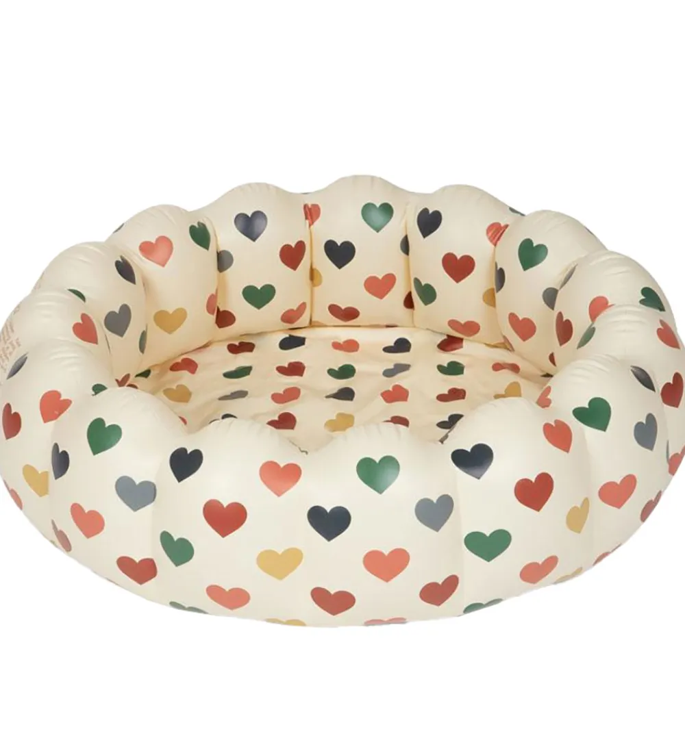 Lækkert Konges Sløjd badebassin i en lys, beige nuance med et farverigt hjerteprint. Badebassinet har en rund form med kanter formet som bølger.