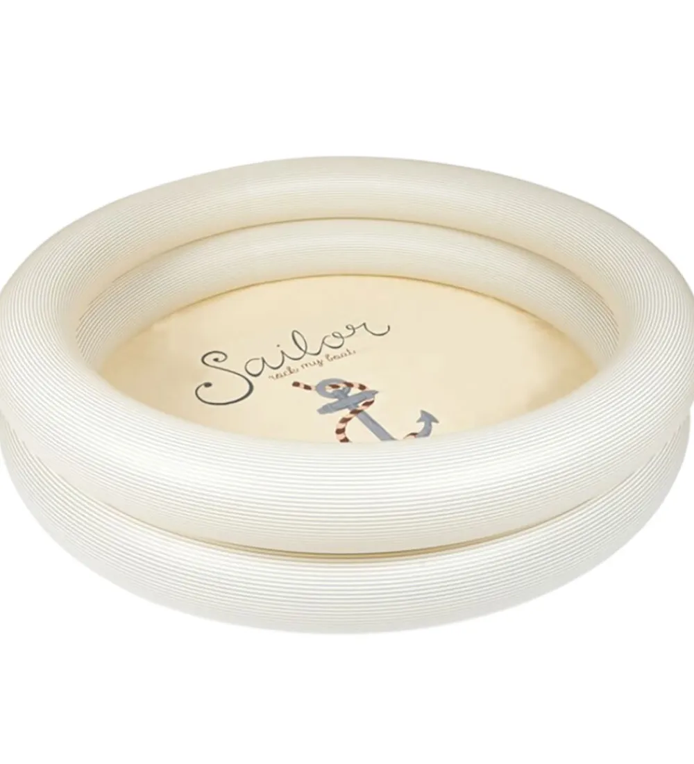 Smukt Konges Sløjd badebassin i en sart, råhvid nuance. Bunden prydes af et charmerende sejlerprint med et anker og teksten “Sailor”. Badebassinet har en rund form og består af to ringe.