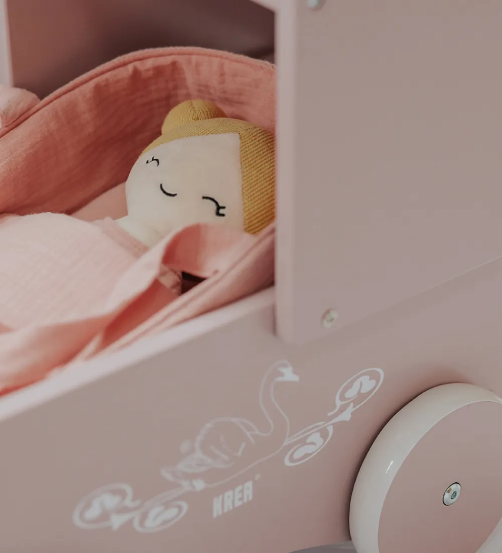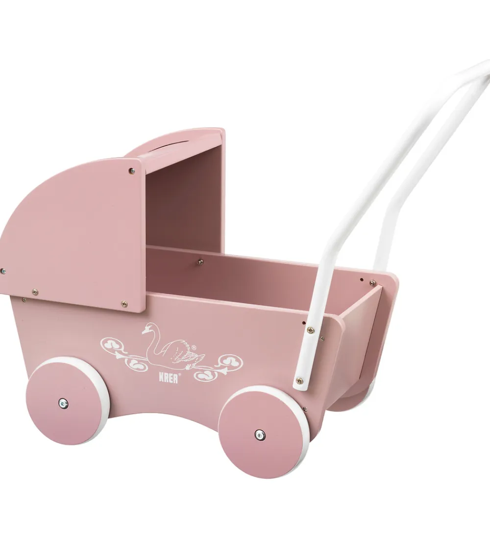 Krea dukkevognen er lavet af træ og har praktiske gummihjul, som ikke beskadiger trægulvet, reolen eller væggen. Dukkevognen kan bruges som gåvogn og senere bruges som grobund, for en sjov og lærerig rolleleg med dukker, bamser og meget andet.