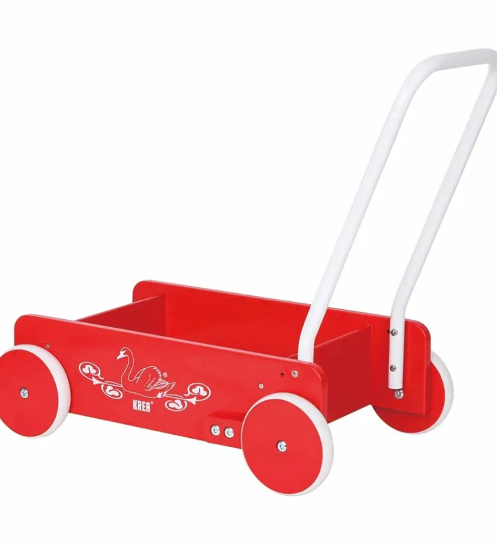 Krea gåvognen er lavet af træ og har praktiske gummihjul, som ikke beskadiger trægulvet, reolen eller væggen. Gåvognen er udstyret med praktiske bremser, som sørger for, at den kører langsomt og sikkert, og at den ikke triller væk under barnet. Styret kan justeres med skurer, så det kan få to forskellige hældninger.