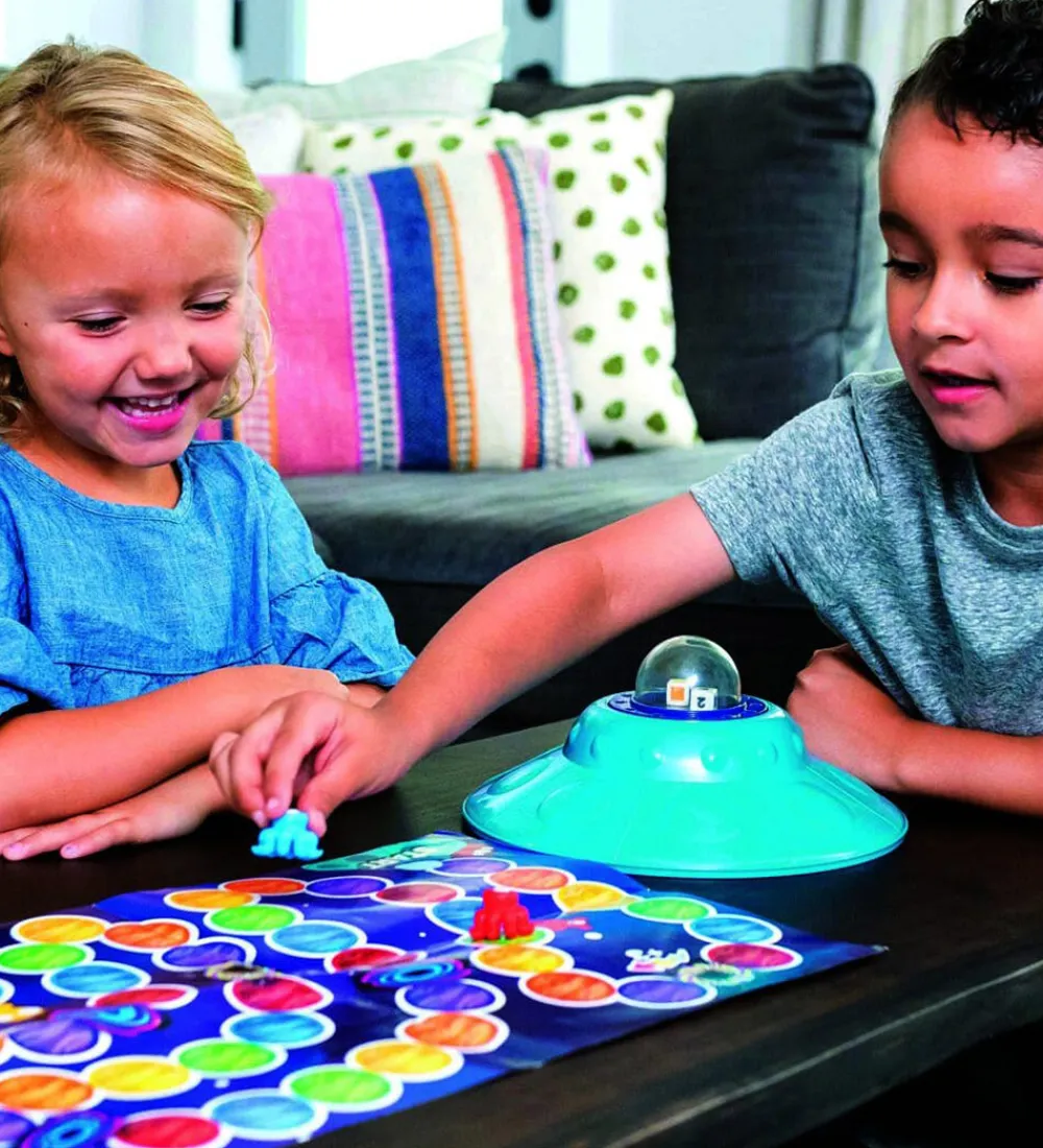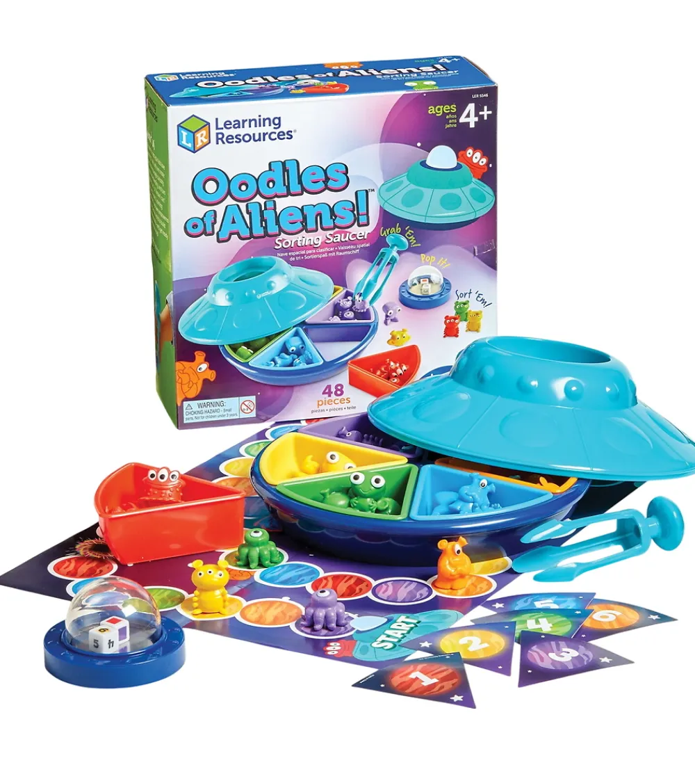 I dette spil skal man hjælpe rumvæsnerne med at komme rigtigt på plads i deres flyvende tallerken. Brug den store pincet til at gribe fat i rumvæsnerne. Der medfølger også forslag til andre lege, hvor børn kan prøve at farvesortere, tælle, genkende farver og udvikle finmotorikken.