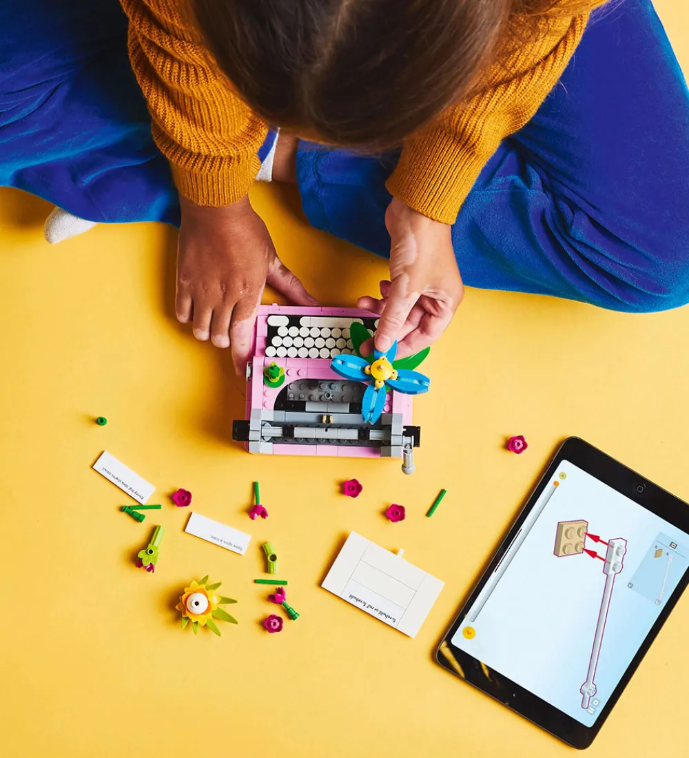 Sejt LEGO® Creator sæt med i alt 363 klodser, som kan samles til hele tre forskellige ting: en skrivemaskine med blomster, et keytar på et stativ med blomster og en urtepotte med pen og notesbog.