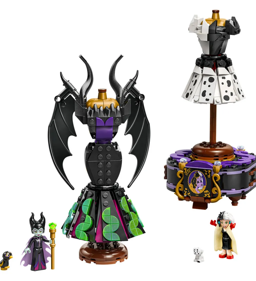 Detaljeret LEGO® Disney sæt med 524 klodser, der kan samles til ikoniske roterende modeller af Maleficents og Cruella de Vils kjoler. Sættet indeholder også minifigurer af de to karakterer samt små dekorative elementer, der understreger deres karakteristiske stil.