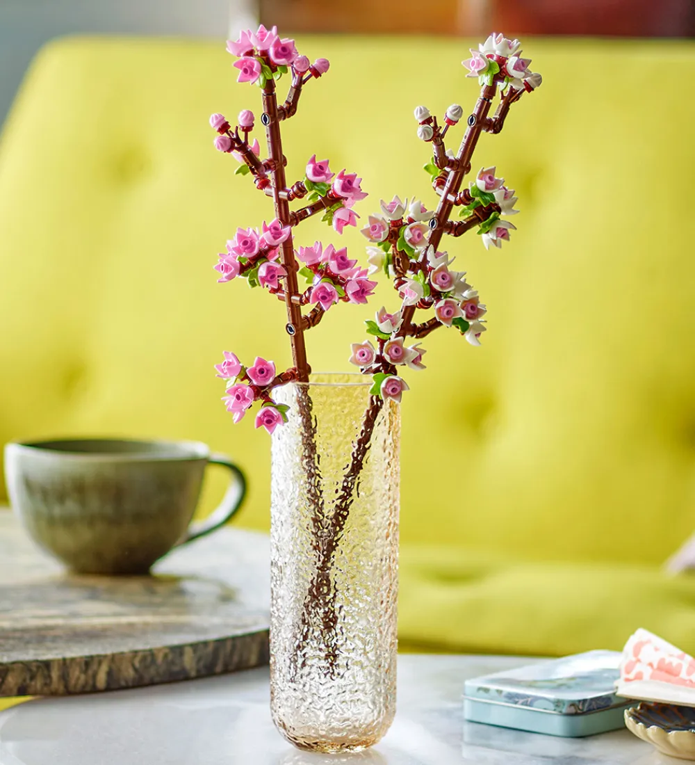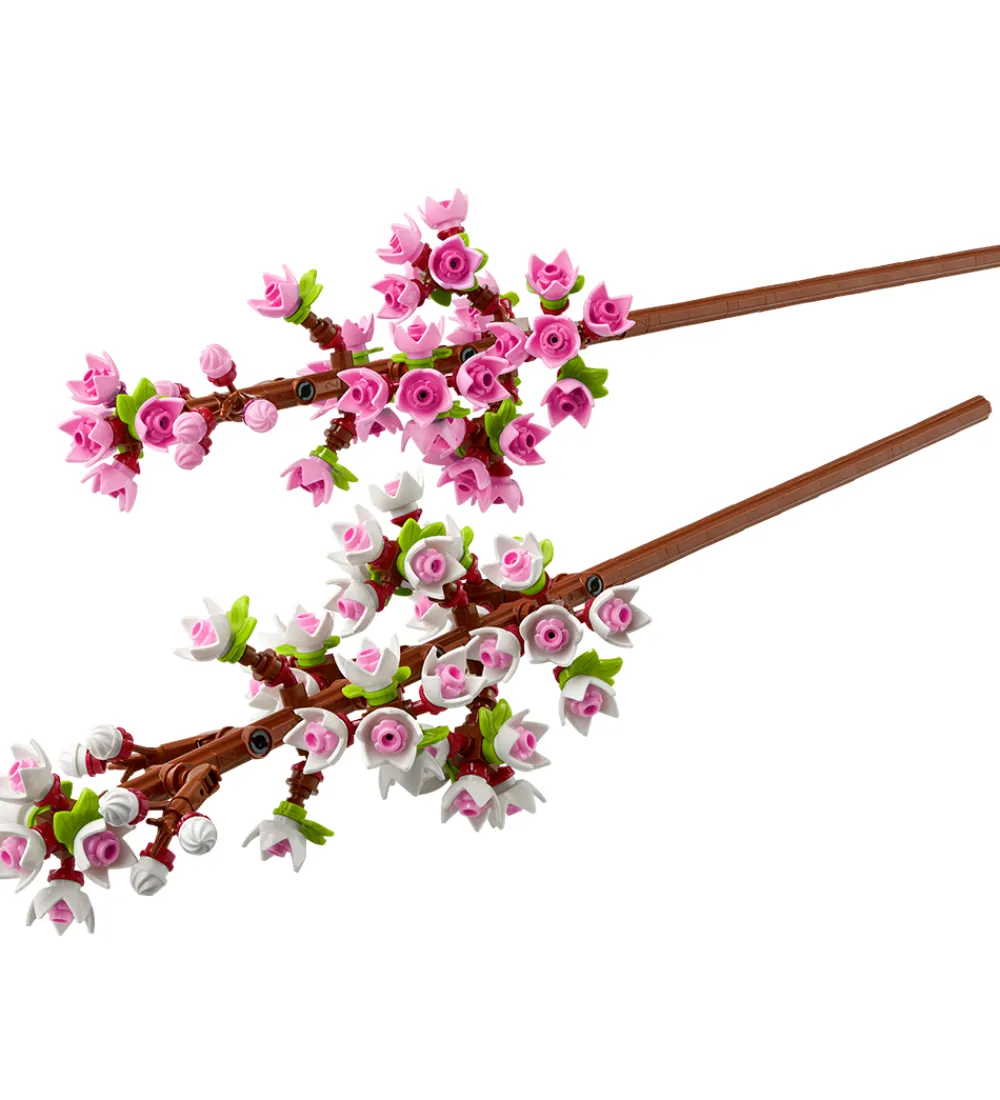 LEGO® blomsterne har fine blomsterknopper på de to brune kirsebærgrene er i fuldt flor og har grønne blade samt stængler, som kan justeres i længden.