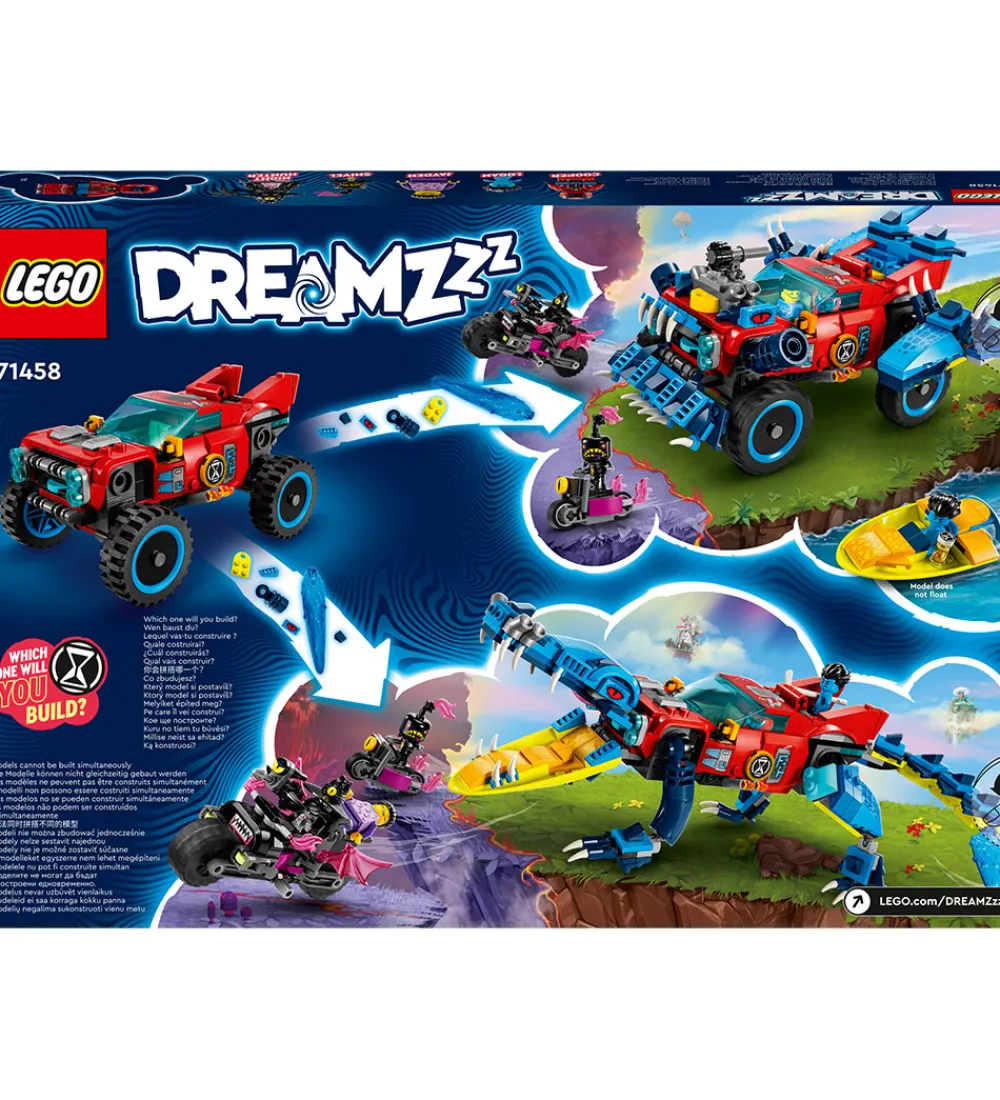 LEGO® DREAMZzz sættet inviterer ind i en fantasiverden, hvor børnene skal redde Jayden fra Nattejægeren. Fartøjet kan bygges enten som krokodillebil, der kan bekæmpe mareridtene eller som offroader samt minibåd, der kan jagte dem.