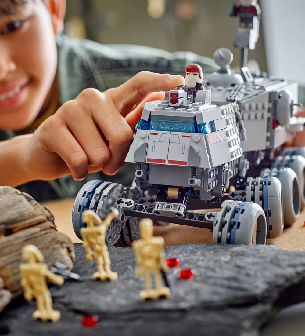 Imponerende LEGO® Star Wars sæt med i alt 813 klodser, som kan samles til en detaljeret model af Republic Juggernaut. Sættet indeholder bevægelige hjul, cockpit og kanoner, samt hele 10 minifigurer: Luminara Unduli, Quinlan Vos, Clone Commander Gree, Clone Trooper, to Kashyyyk Clone Troopers og fire Battle Droids.