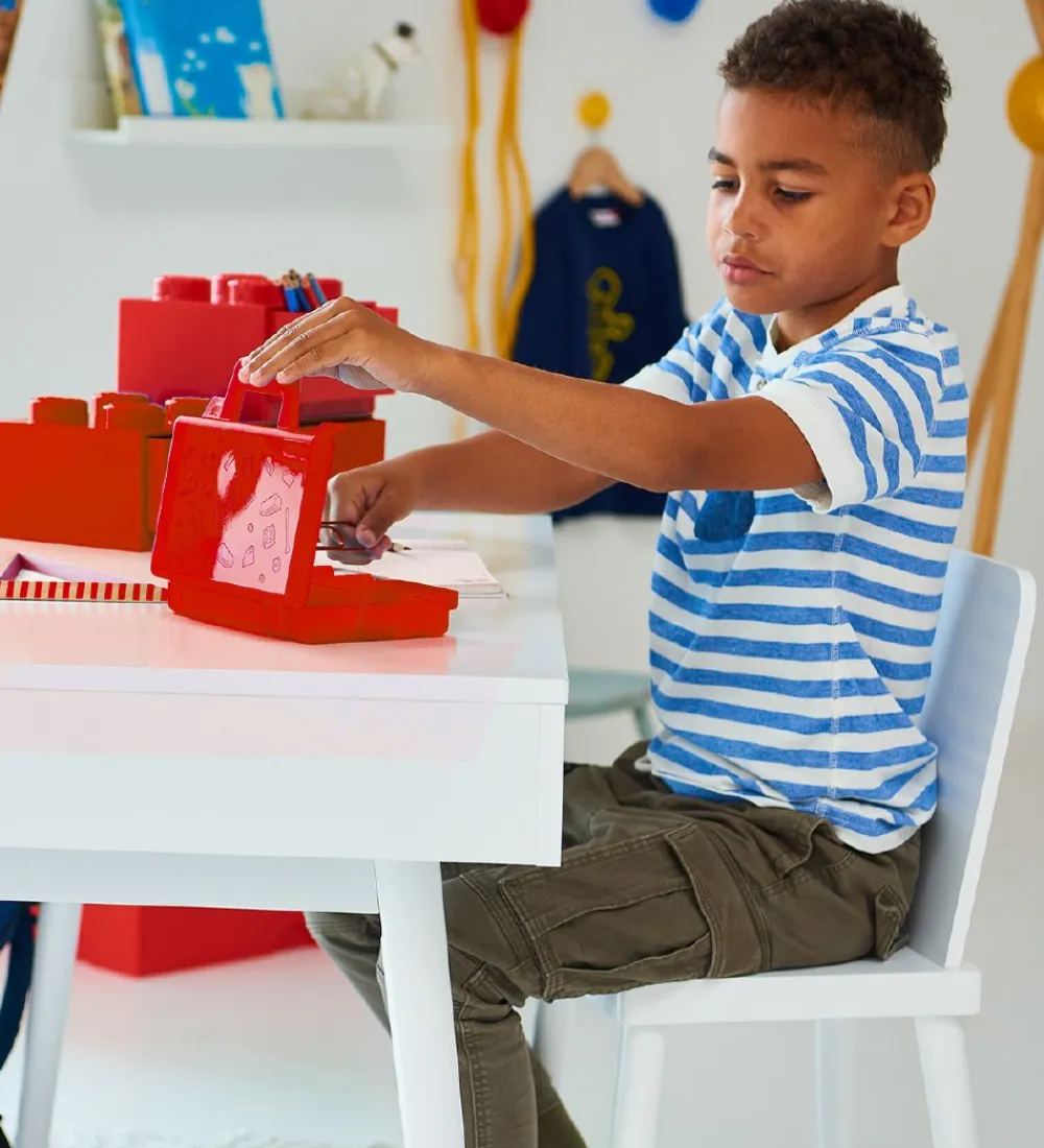 LEGO® Storage rejsekufferten består af 4 opdelt rum til opbevaring eller sorting af figurer og klodser. Den kan også bruges som et penalhus. Kassen har en smart lukning, så indholdet naturligvis bliver inde, når man har kassen med sig.