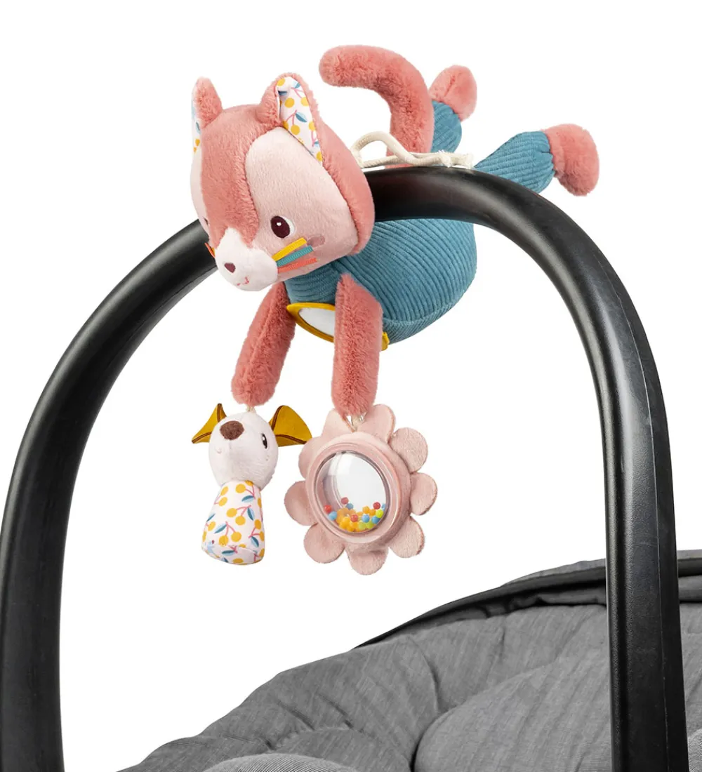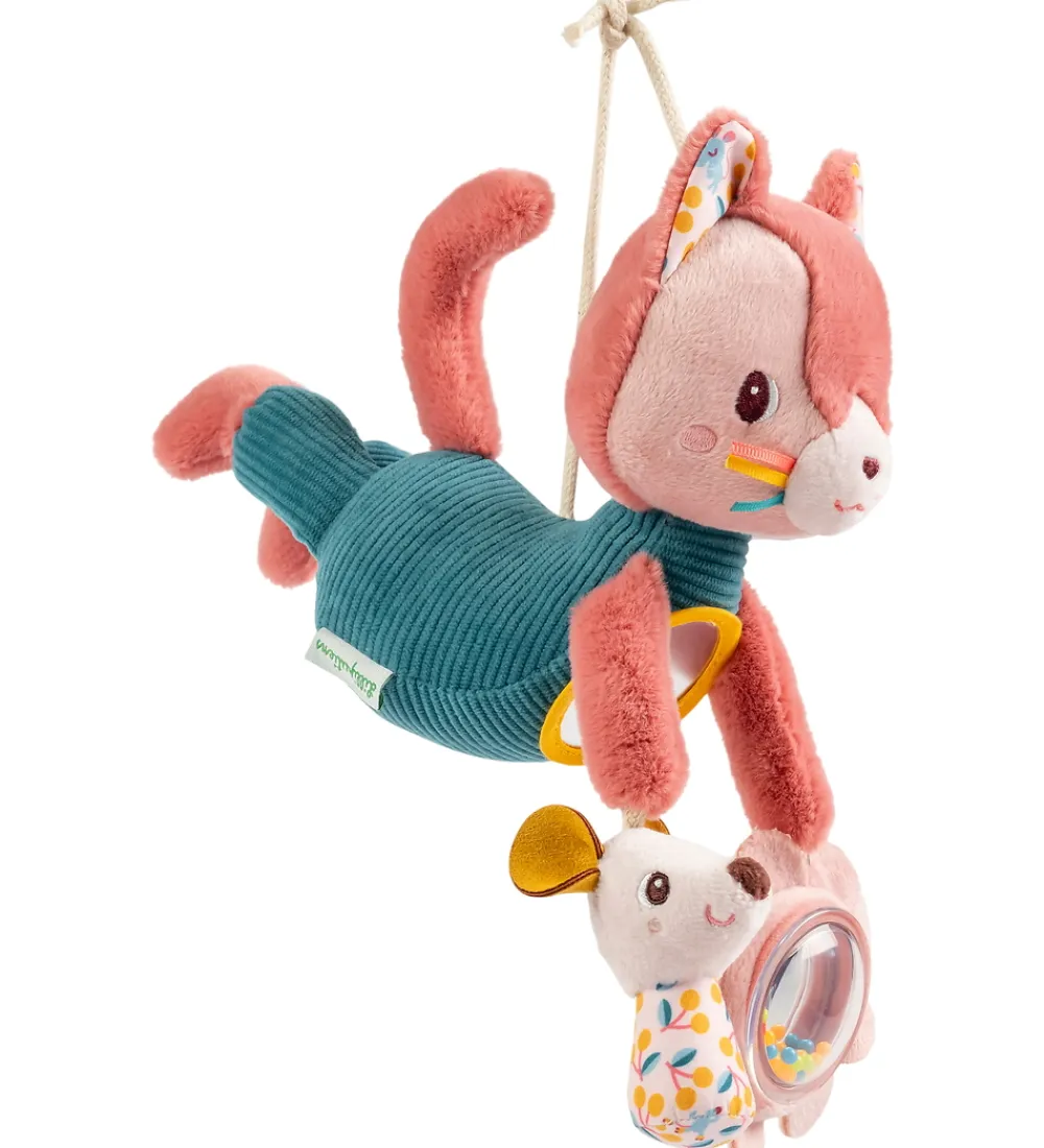 Charmerende Lilliputiens aktivitetslegetøj i form af katten Jeanne i rosa og grøn med farverige detaljer. Katten har et spejl på maven, en knitrende mus i den ene hånd og en blomst med spejl og kugler indeni i den anden hånd. Katten har en snor bagpå, så man kan hænge den fast på f.eks. et legestativ, så barnet kan ligge og lege med den.