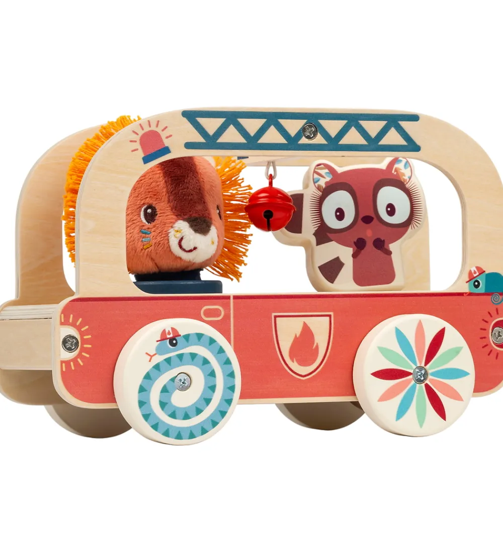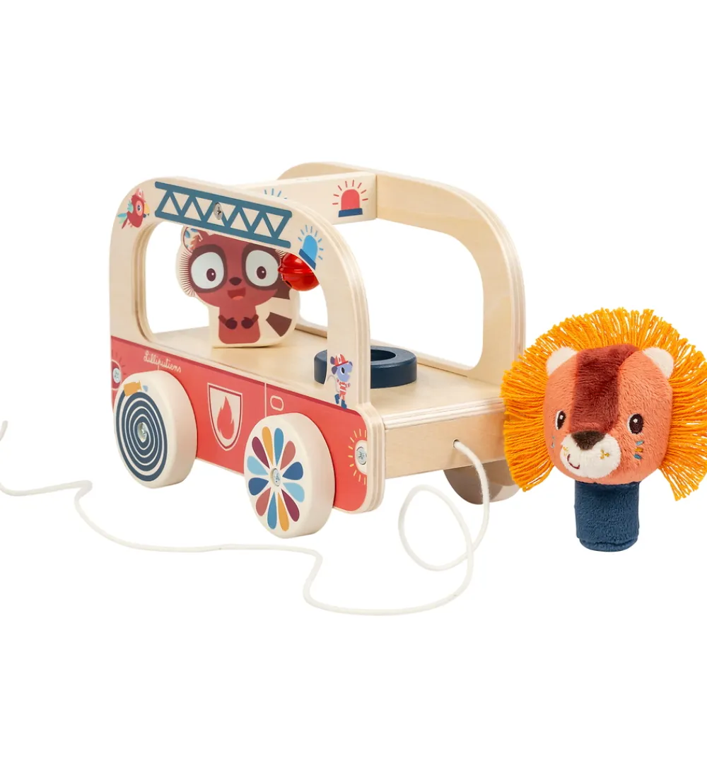 Herligt træklegetøj fra Lilliputiens formet som en brandbil i træ med farverige detaljer. I brandbilen sidder løven Jack og en lemur. Løven er blød og kan tages ud af brandbilen mens lemuren er lavet af træ, og drejer rundt når brandbilen kører. Brandbilen er udstyret med en klokke og fire hjul med billeder på siderne, som skaber en optisk illusion når de drejer rundt. Brandbilen trækkes med en snor foran.
