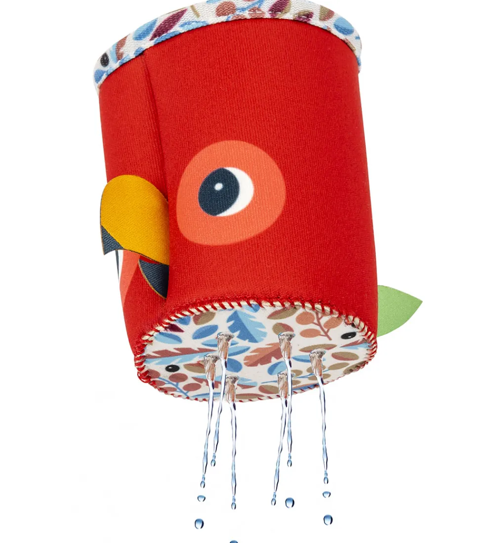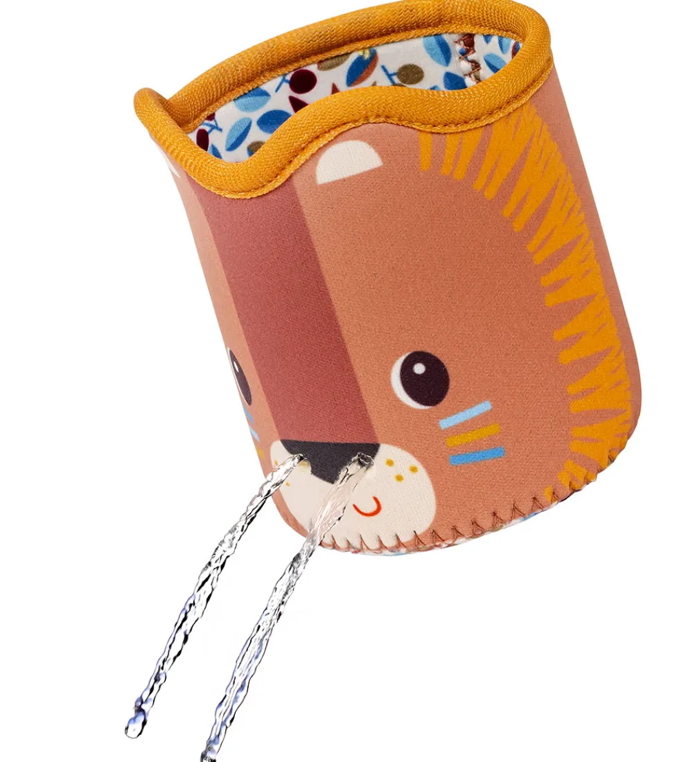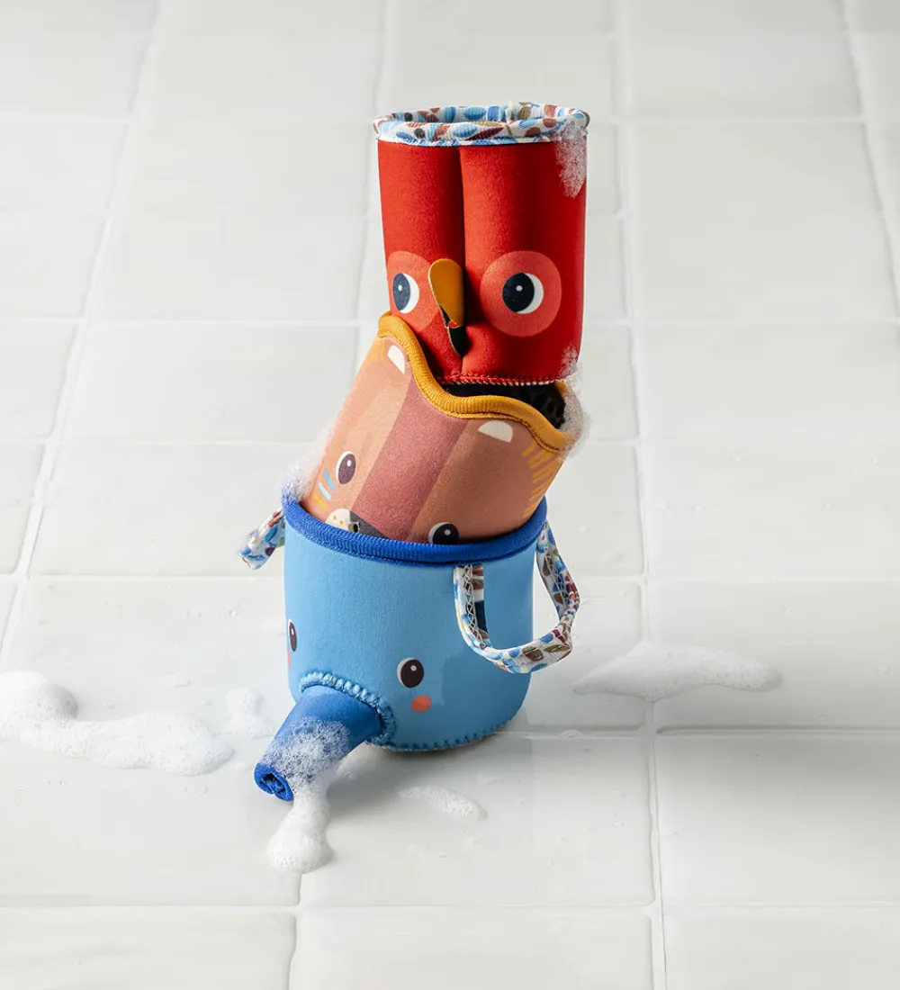 Smart Lilliputiens badelegetøj bestående af tre badekoppe med design som en fugl, en løve og en elefant. Badekopperne har huller i, så når de fyldes op, løber vandet ud af hullerne. Elefanten har håndtag i begge sider og en snabel, som vandet hældes ud af.