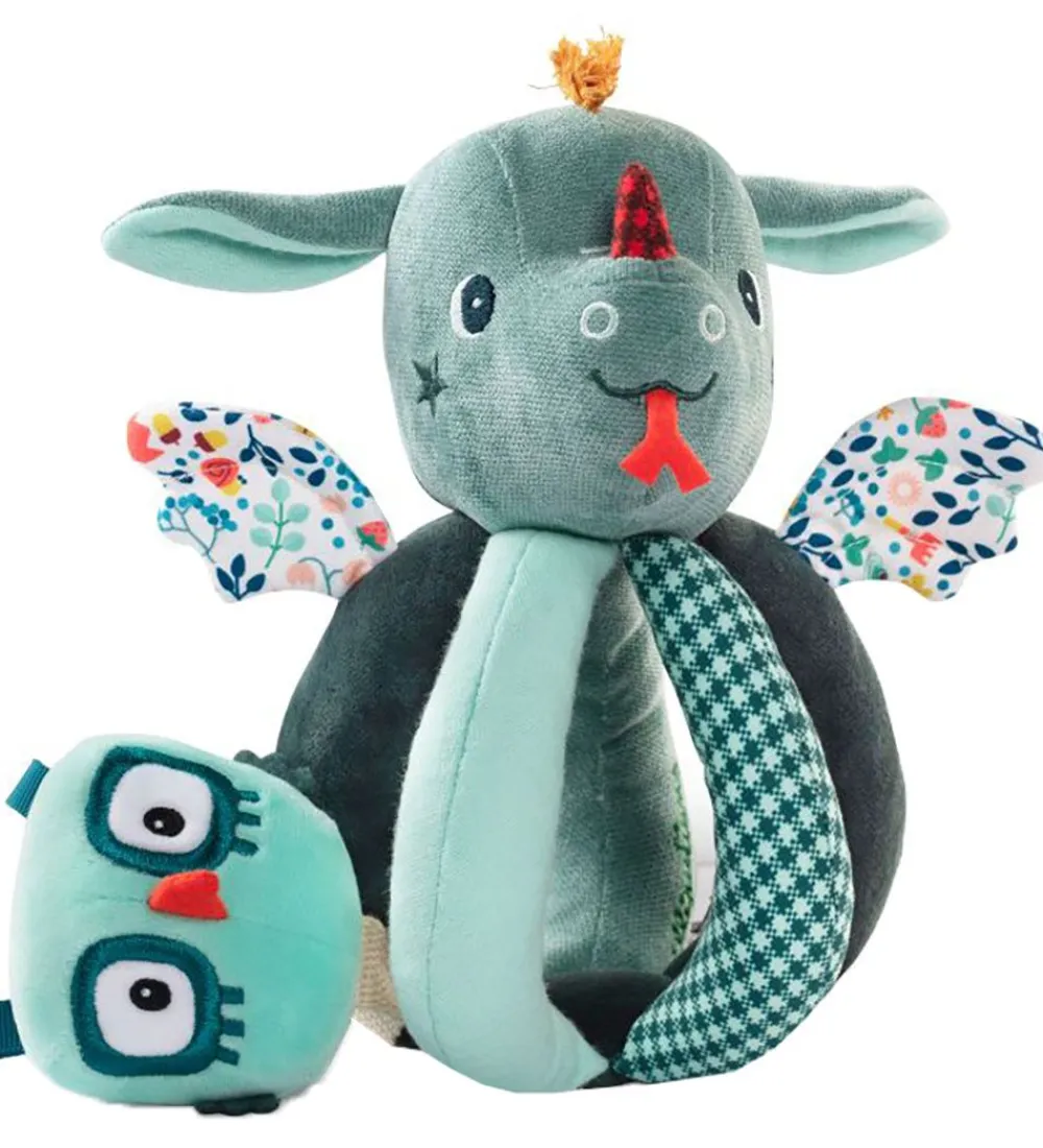 Spændende Lilliputiens aktivitetslegetøj med form som et sødt, grønt dyr, hvor en sød fugl gemmer sig bag håndtagene til ranglen.