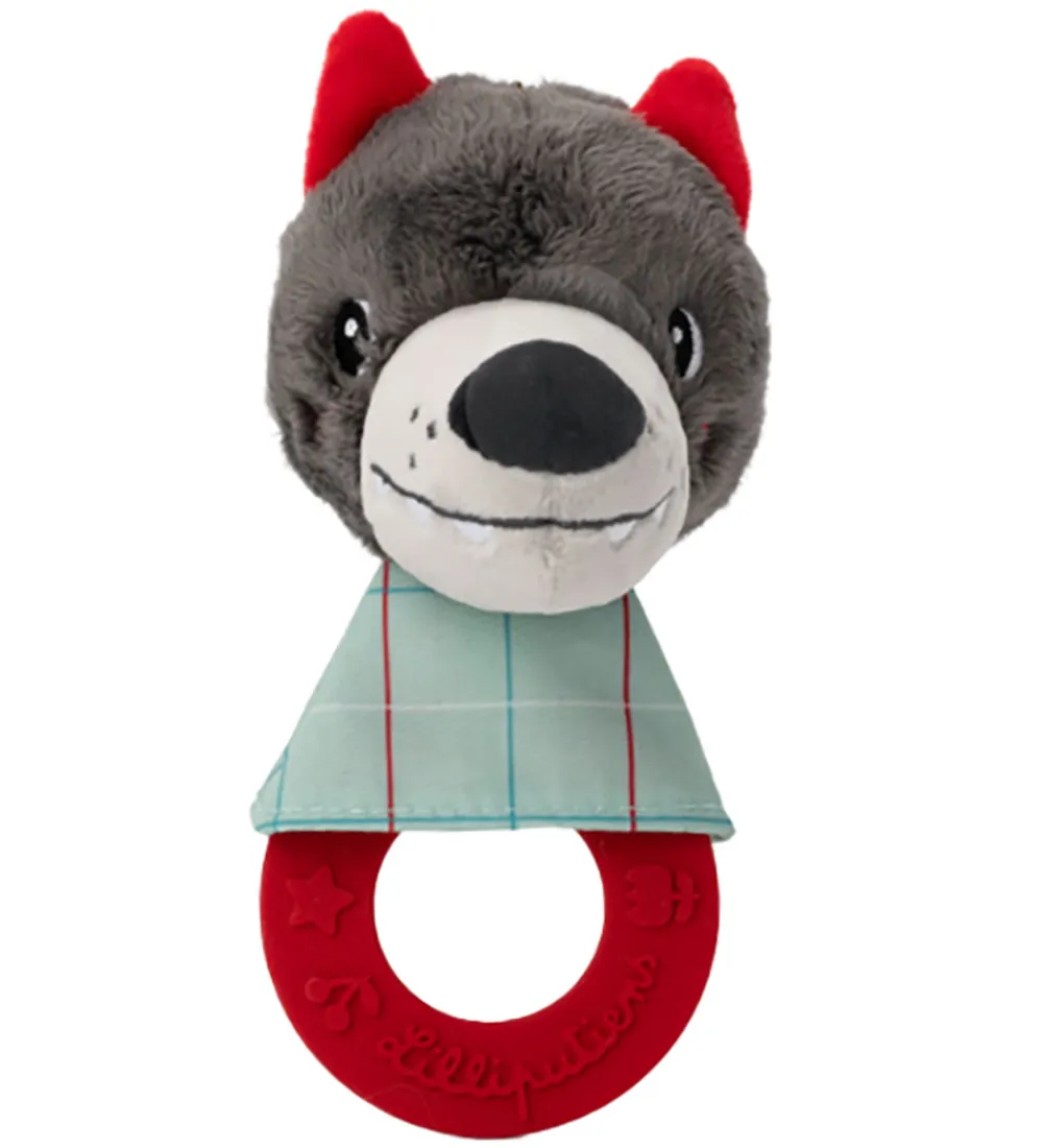 Sød Lilliputiens biderangle med ulven Louis i grå, røde og grønne farver.