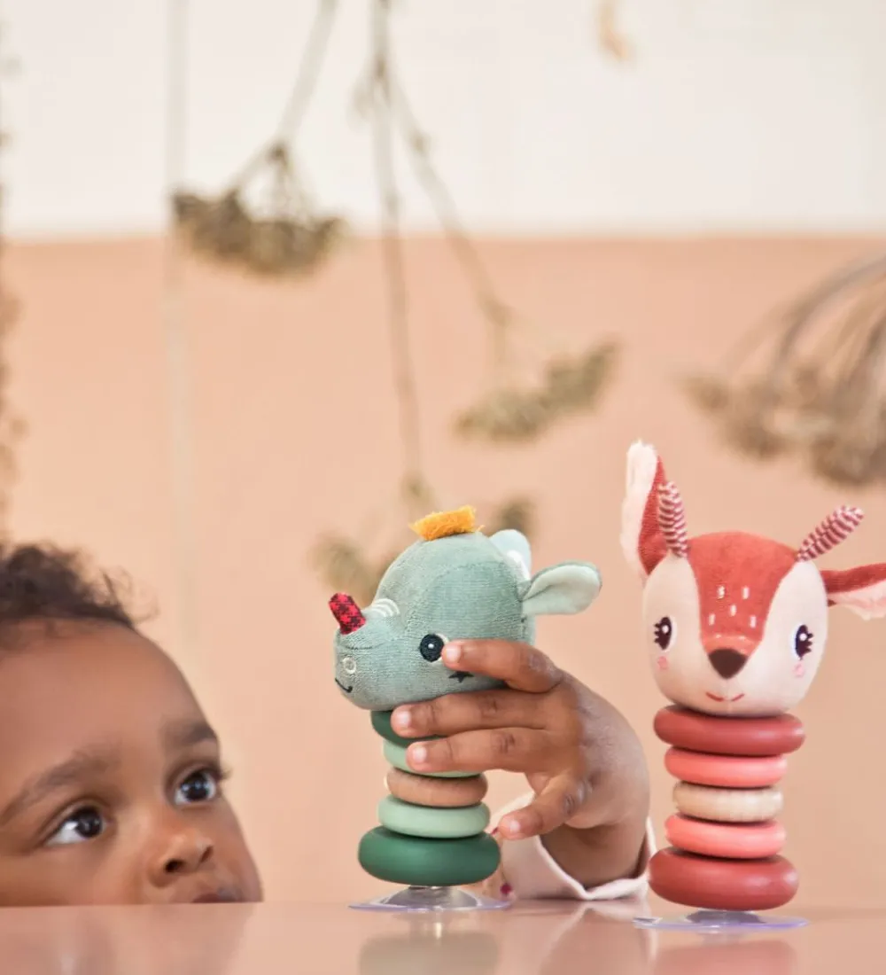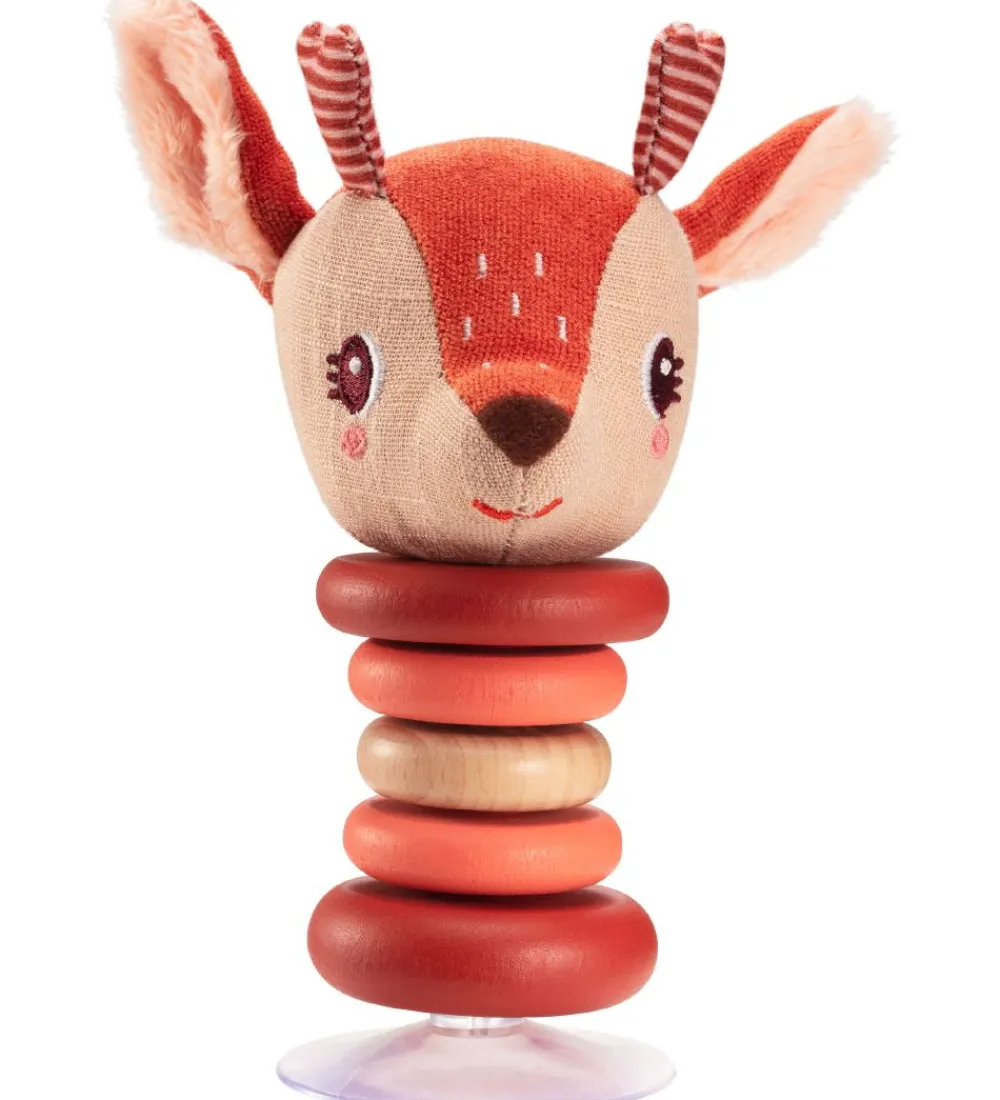 Fin Lilliputiens rangle i brun med et bambi-hoved på toppen med træ-ringe i naturligt træ, rosa og brun.