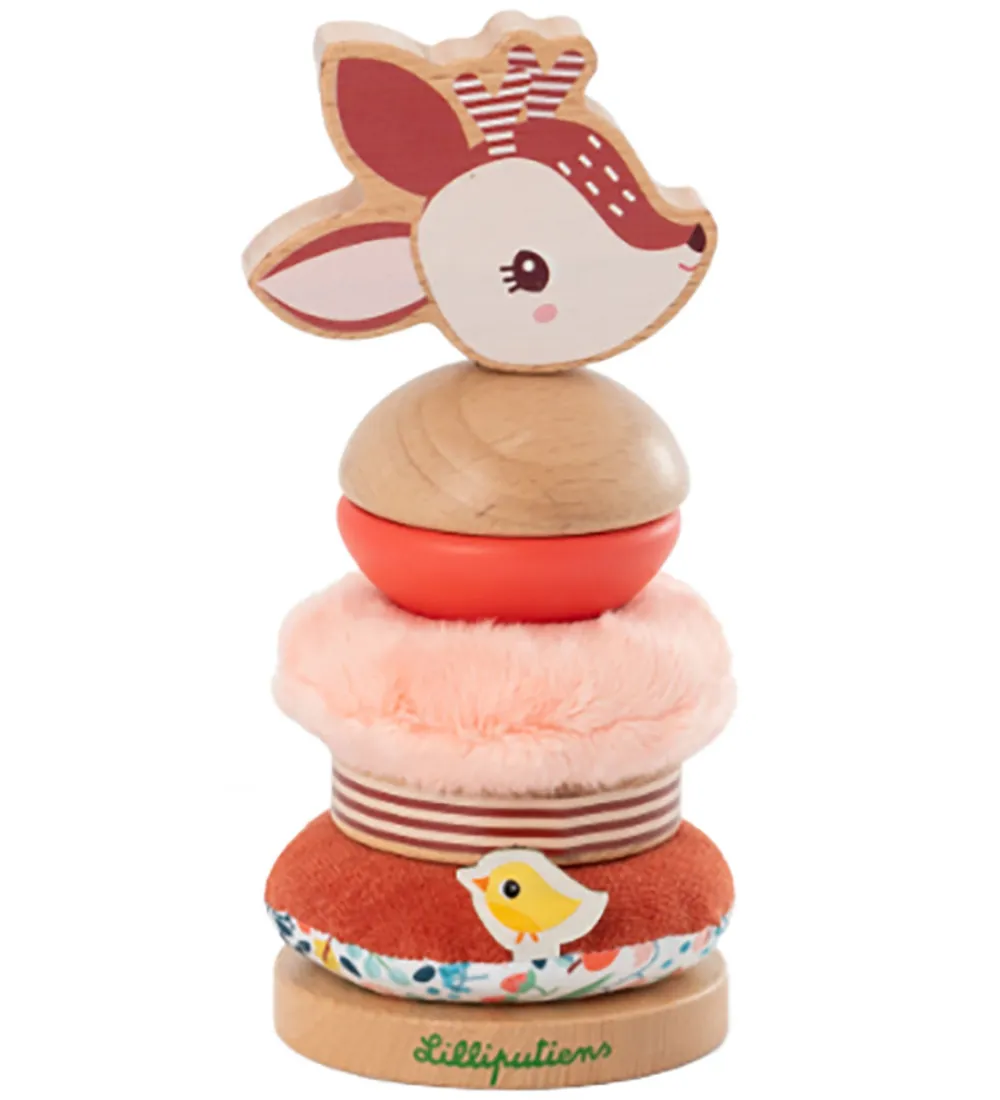 Fint Lilliputiens stabletårn i træ og tekstil med hjorten Stella. Stabletårnet består af i alt 7 dele.