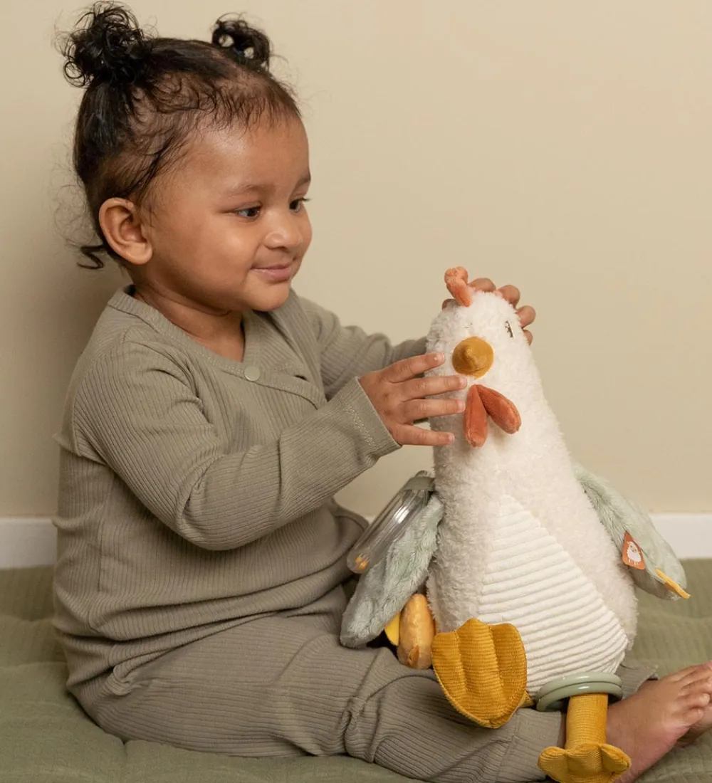Sød Little Dutch aktivitetsbamse i form af en plysset og blød høne med forskellige strukturer og aktiviteter.