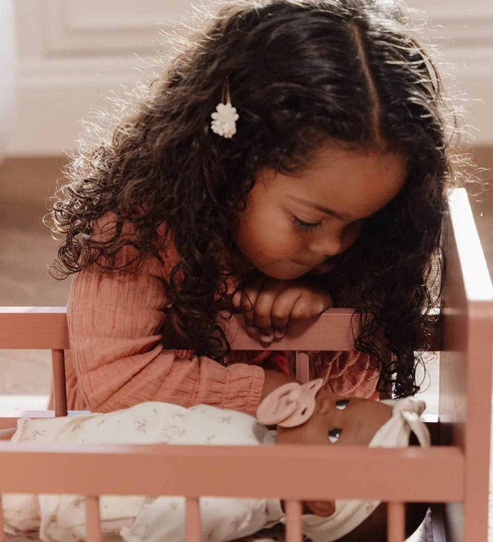 Charmerende Little Dutch dukke iført en kjole og et par bukser med fint blomstermønster samt en rosafarvet cardigan. Little Dutch dukken har en matchende hårbånd med blomsterprint og kommer med en sød flaske og sut.