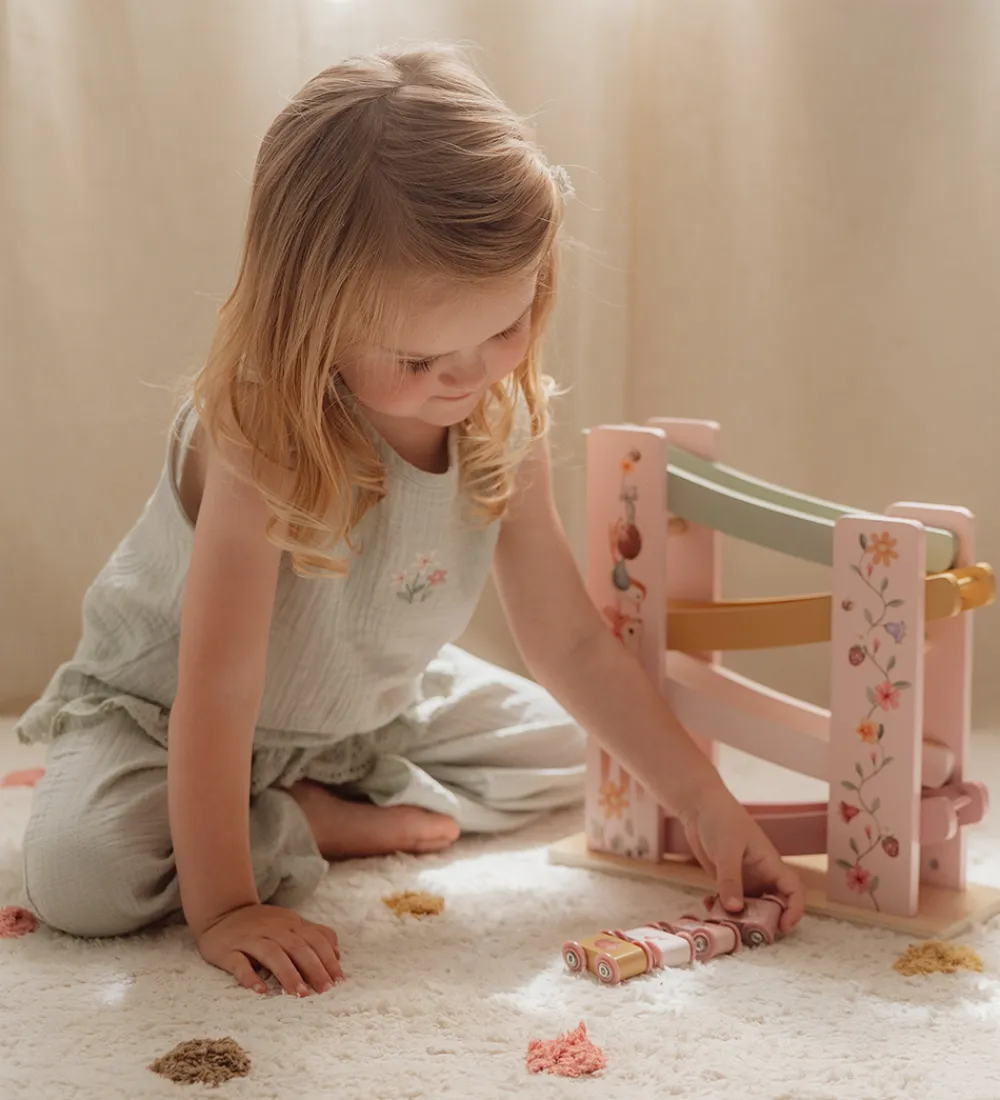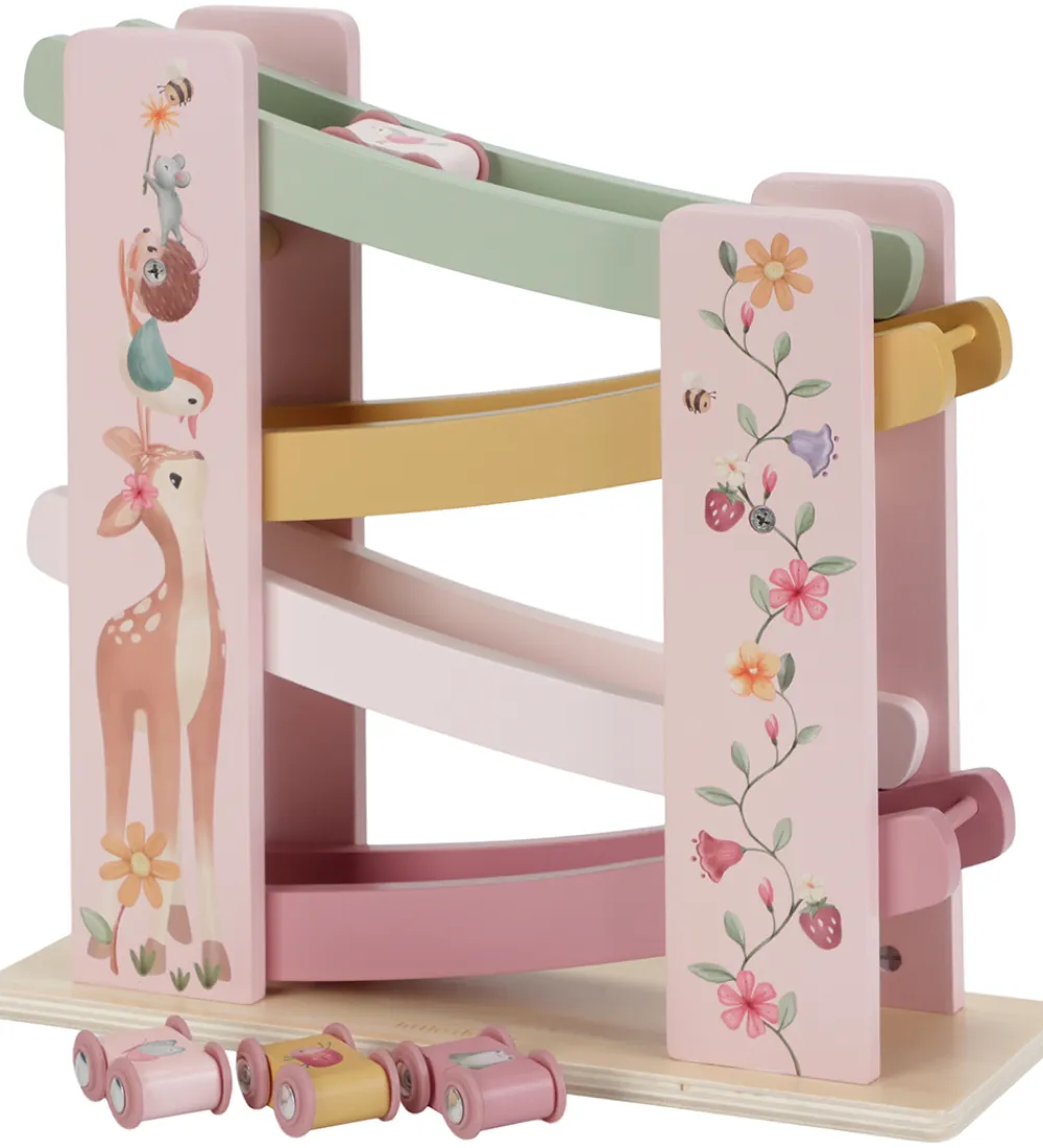 Little Dutch kuglebanen har fire små køretøjer, som kan køre ned af banen. Banen er formet på en smart måde, så kuglerne triller uden problemer og gør det sjovt for de små, at køre dem lige efter hinanden gang på gang.