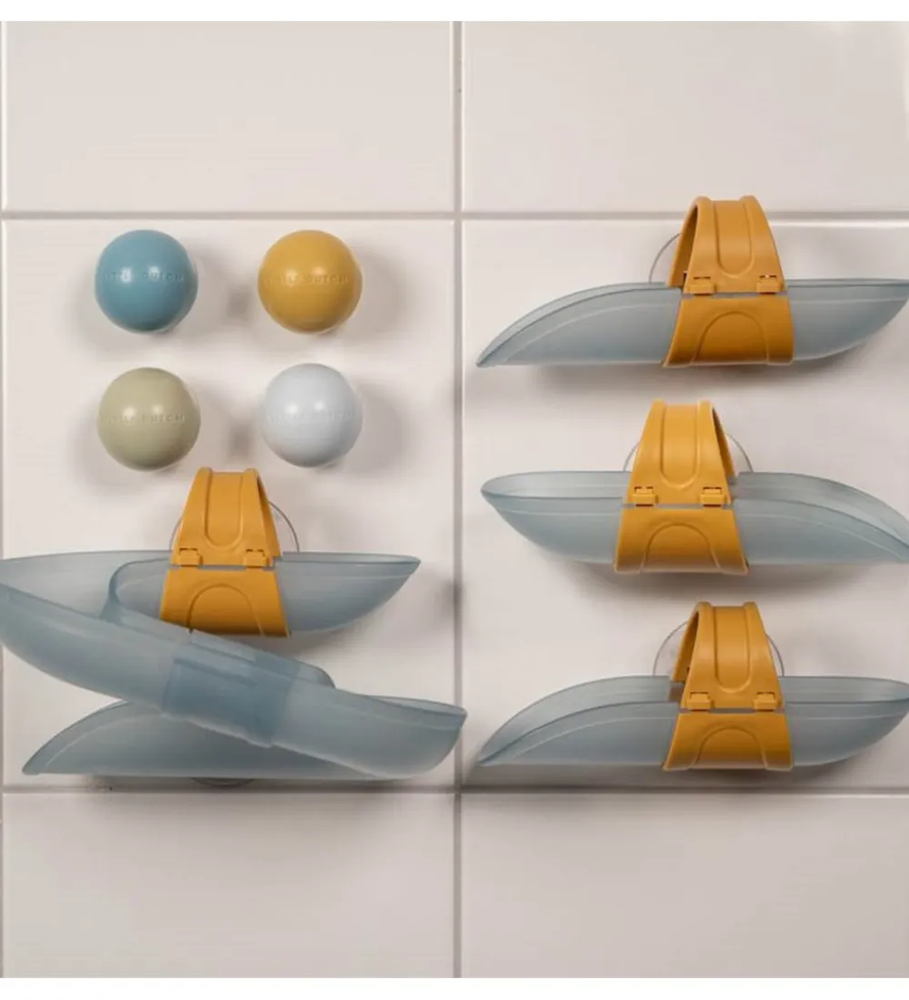 Little Dutch bådene hænges op med sugekopper på badeværelsesfliserne i forskudt af hinanden, så de tilsammen danner en kuglebane, som de små kan lege med, imens de er i bad.