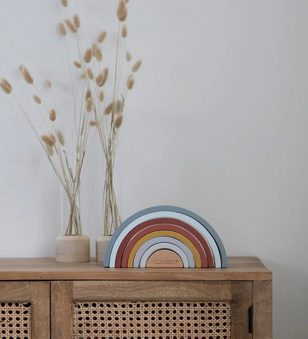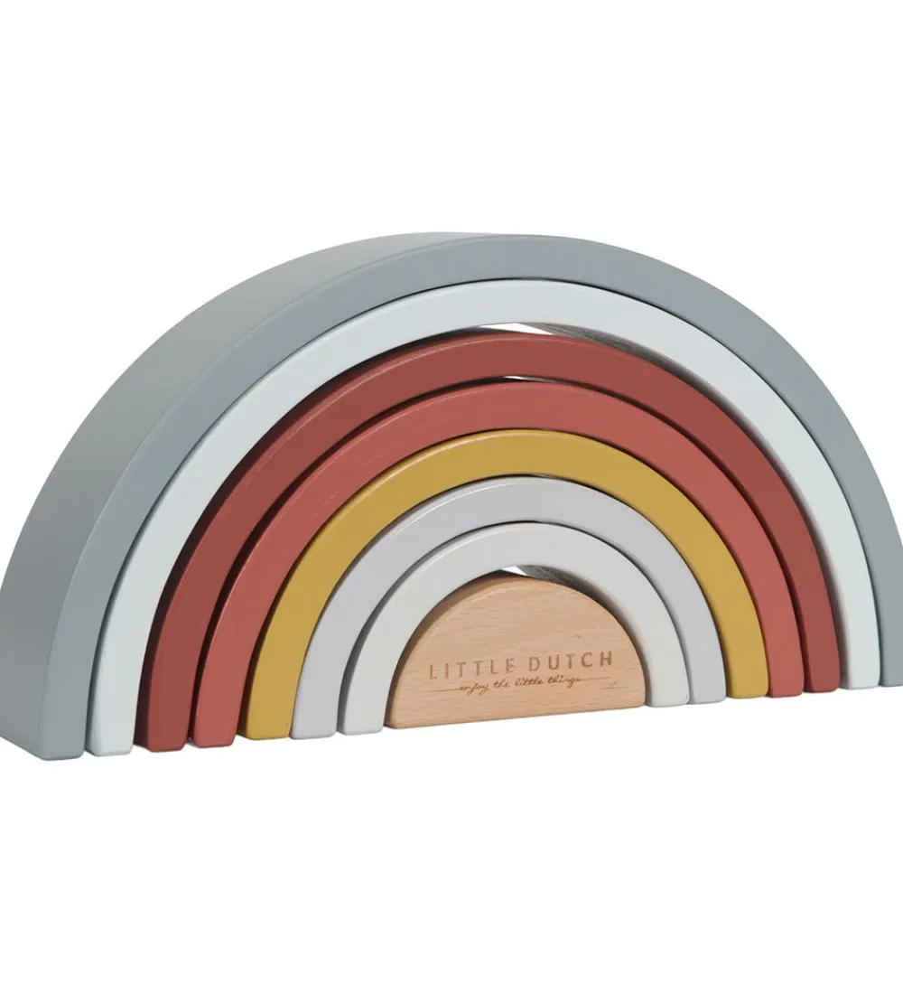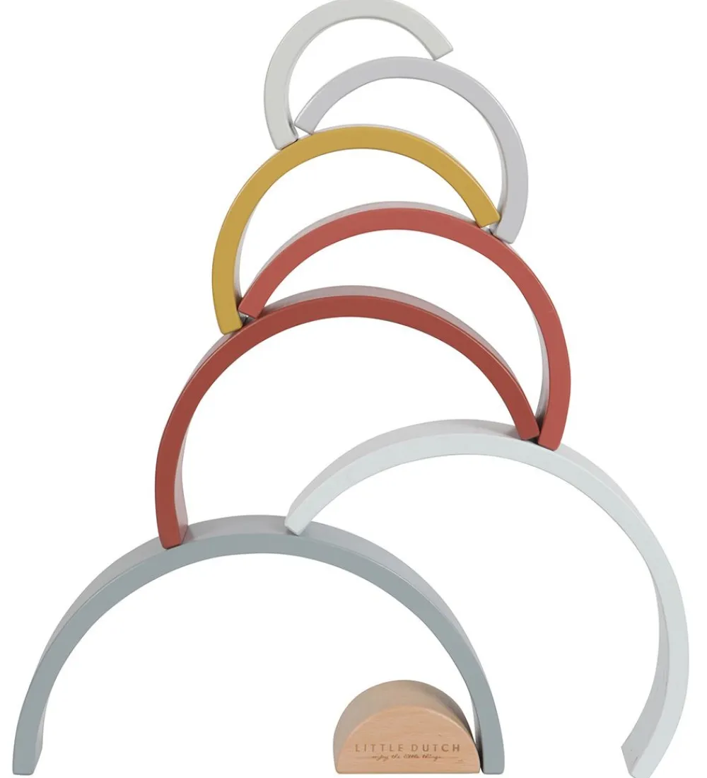 Little Dutch regnbuen er lavet i træ, og er perfekt til de små, som er ved at øve motorikken og den logiske sans. De 8 dele kan stables så de er formet som en regnbue, men de kan også stables på mange andre måder. Når regnbuen ikke bliver leget med er den også dekorativ på børneværelset.