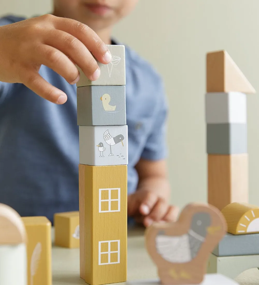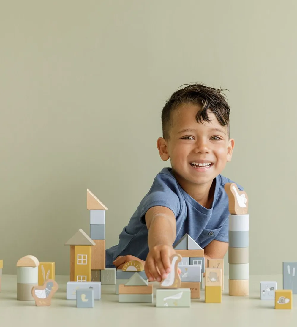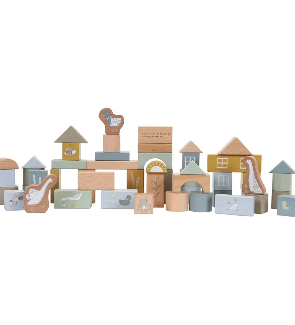 Fine Little Dutch byggeklodser bestående af 50 træklodser i blå, grønne og gule nuancer i mange forskellige former. Klodserne har også søde plante- og dyreprints i hvid.