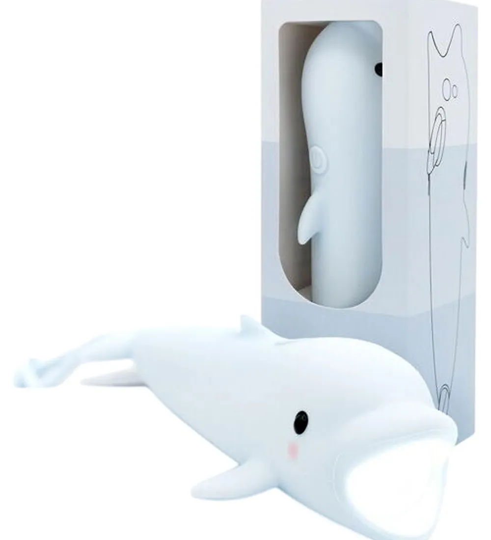 Sød Little L lommelygte i lyseblå med form som en delfin. Lommelygten tændes og slukkes på en knap på toppen. Little L lommelygten kan justeres i lysstyrke og i kold og varm tone. Den kan holde strøm i op til 90 timer. Der medfølger et USB-C ladekabel.