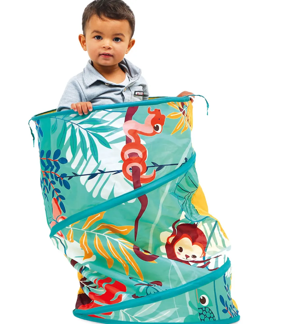 Sjovt Ludi pop-up legetelt med tunnel og bolde i mintgrønt og gul samt med jungleprint.