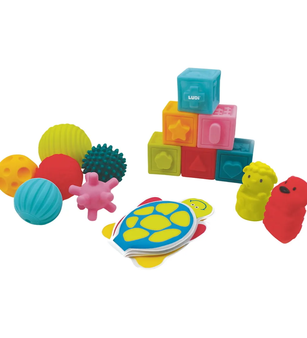 Farverigt Ludi aktivitetslegetøj med 15 former med forskellige teksturer. Ludi legetøjet stimulerer sanserne og er ideelt til udforskning med dets spændende farver og former.