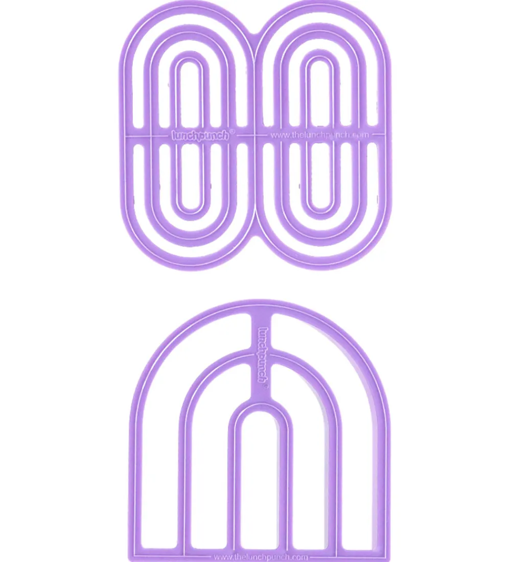 Sjove Lunch Punch udstikkere i lilla med form som regnbuer og solgt som en 2-pak.