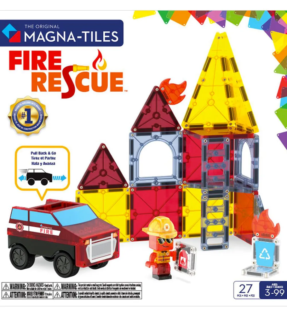 Sejt Magna-Tiles magnetsæt bestående af 27 MicroMAGS og Magna-Tiles i forskellige former og farver, som tilsammen kan danne en brandstation med dertilhørende brandmand og brandbil.