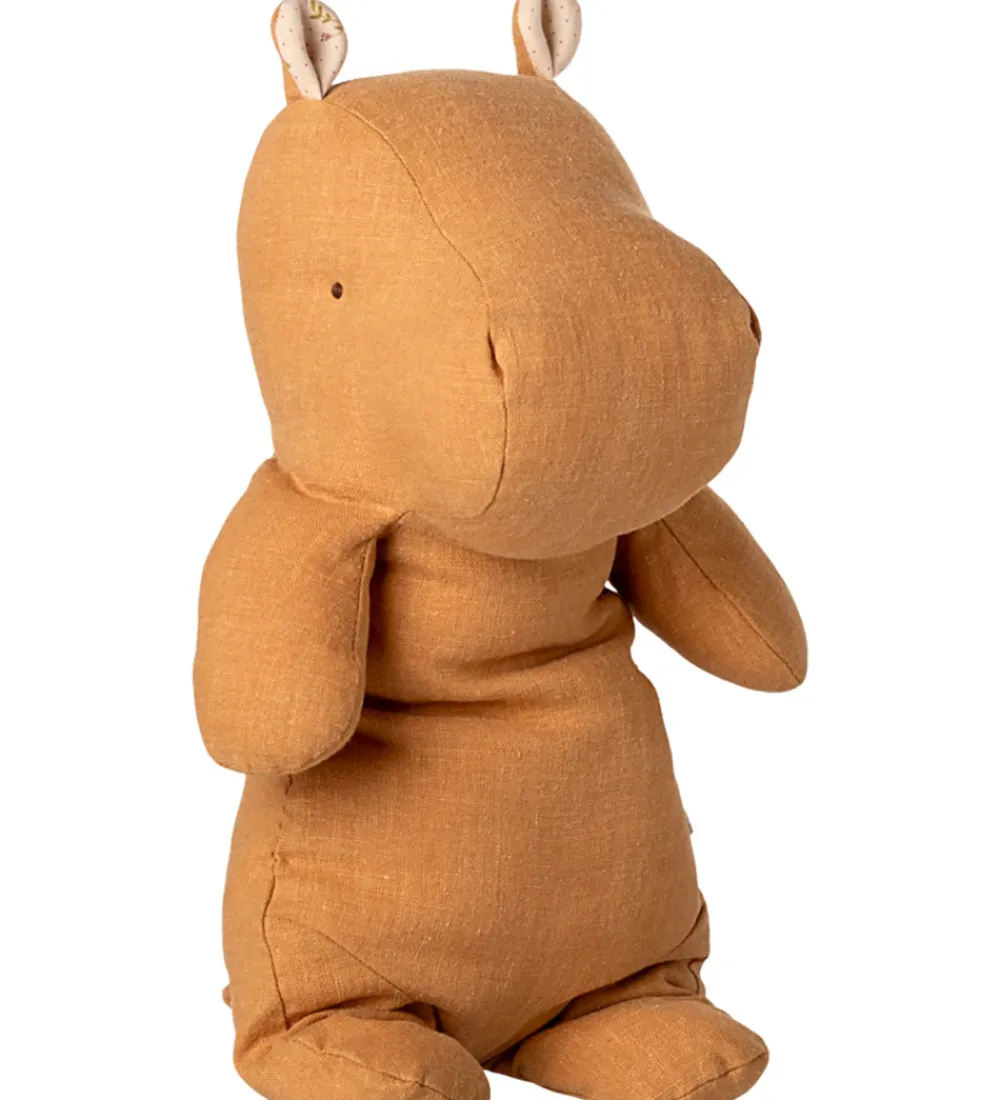 Sød Maileg bamse i form af en flodhest i orange med mønstrede ører. Bamsen har PE-piller i benene, som giver den god tyngde. Den er blød og lige til at lege og kramme med.